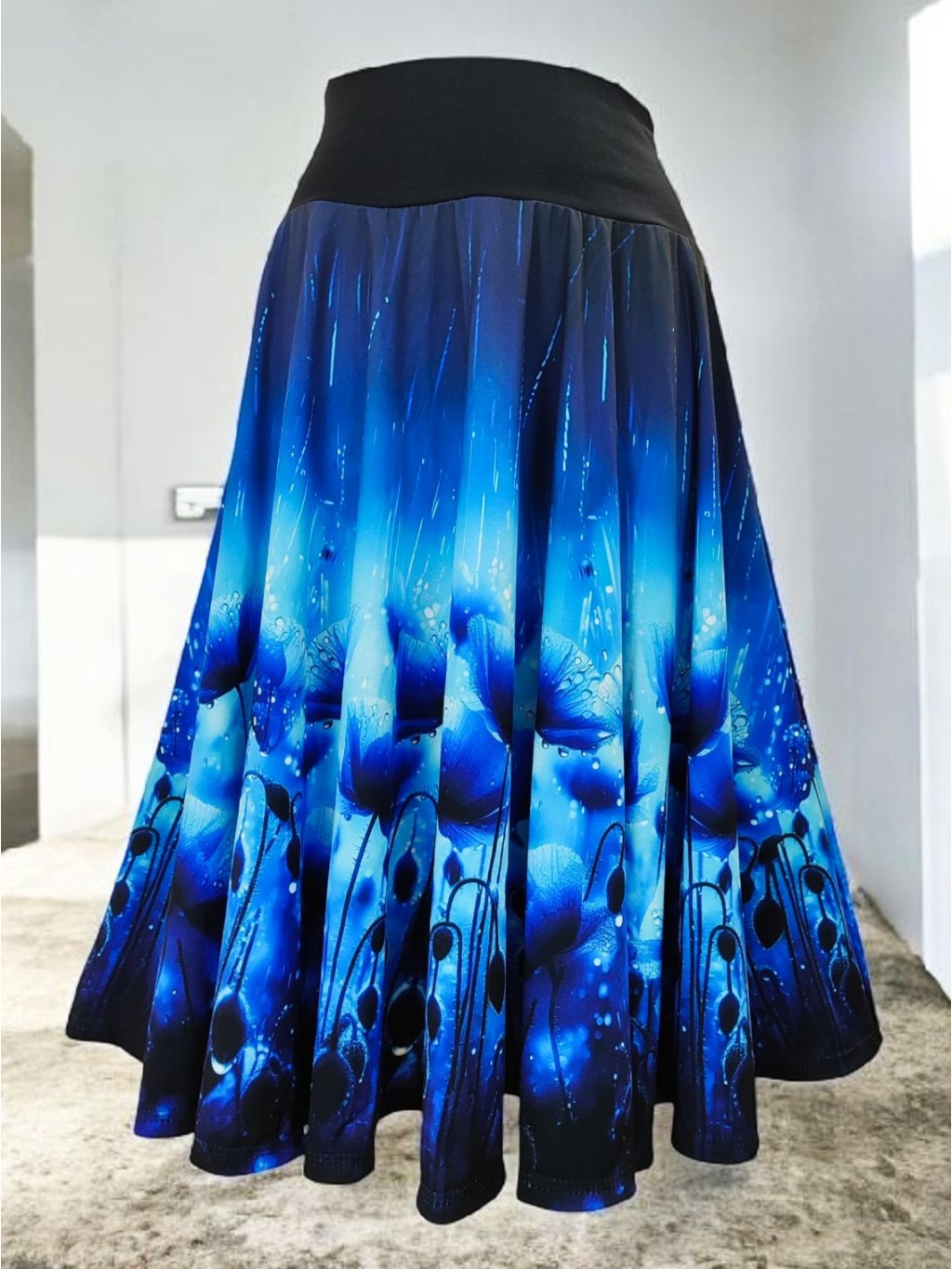 Sukně je kolová, bohatě se vlní. Sukně se nosí v pase nebo na bocích. V pase je pohodlný černý úplet.