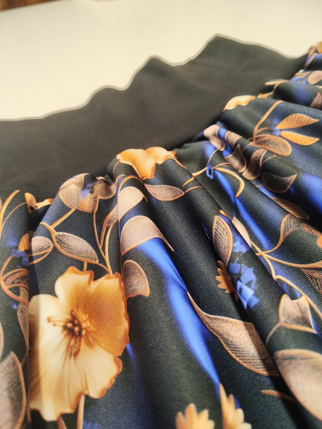 Materiál na sukni je pružný úplet: 92 % polyester/ 8% elastan. V rubu mírně počesaný.