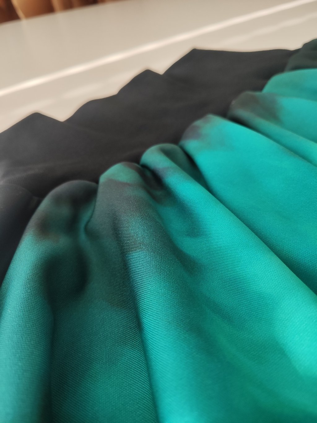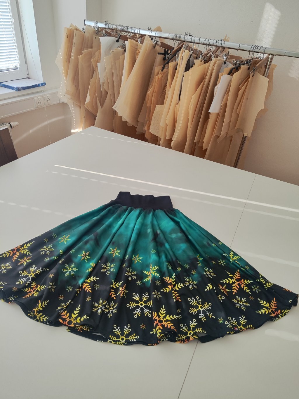 Sukně je kolová, bohatě se vlní. Sukně se nosí v pase nebo na bocích. V pase je pohodlný černý úplet.