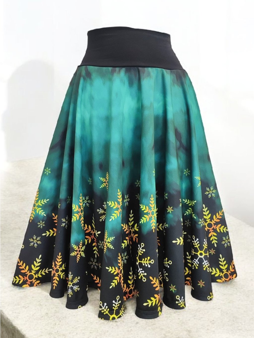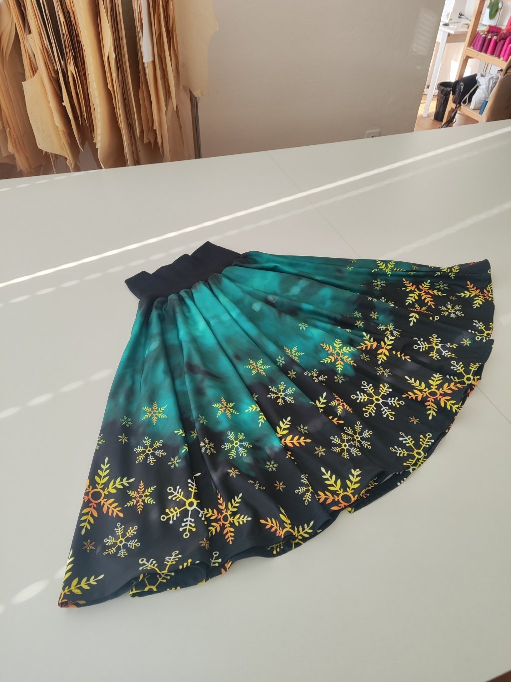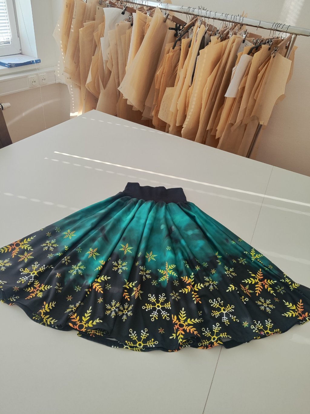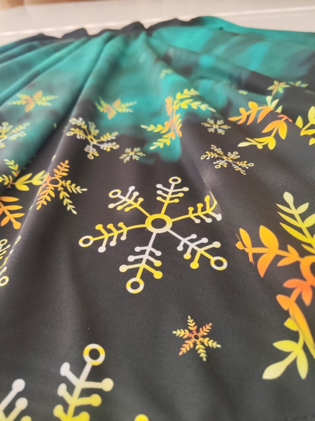 Barva této sukně připomíná hluboký smaragd ponořený do zimní noci, na němž se třpytí zlaté vločky jako hvězdy na obloze. Vzniká tak harmonické spojení elegance, tepla a slavnostní atmosféry. Sukně působí jako tichá zimní pohádka – decentní, přesto zářivá.