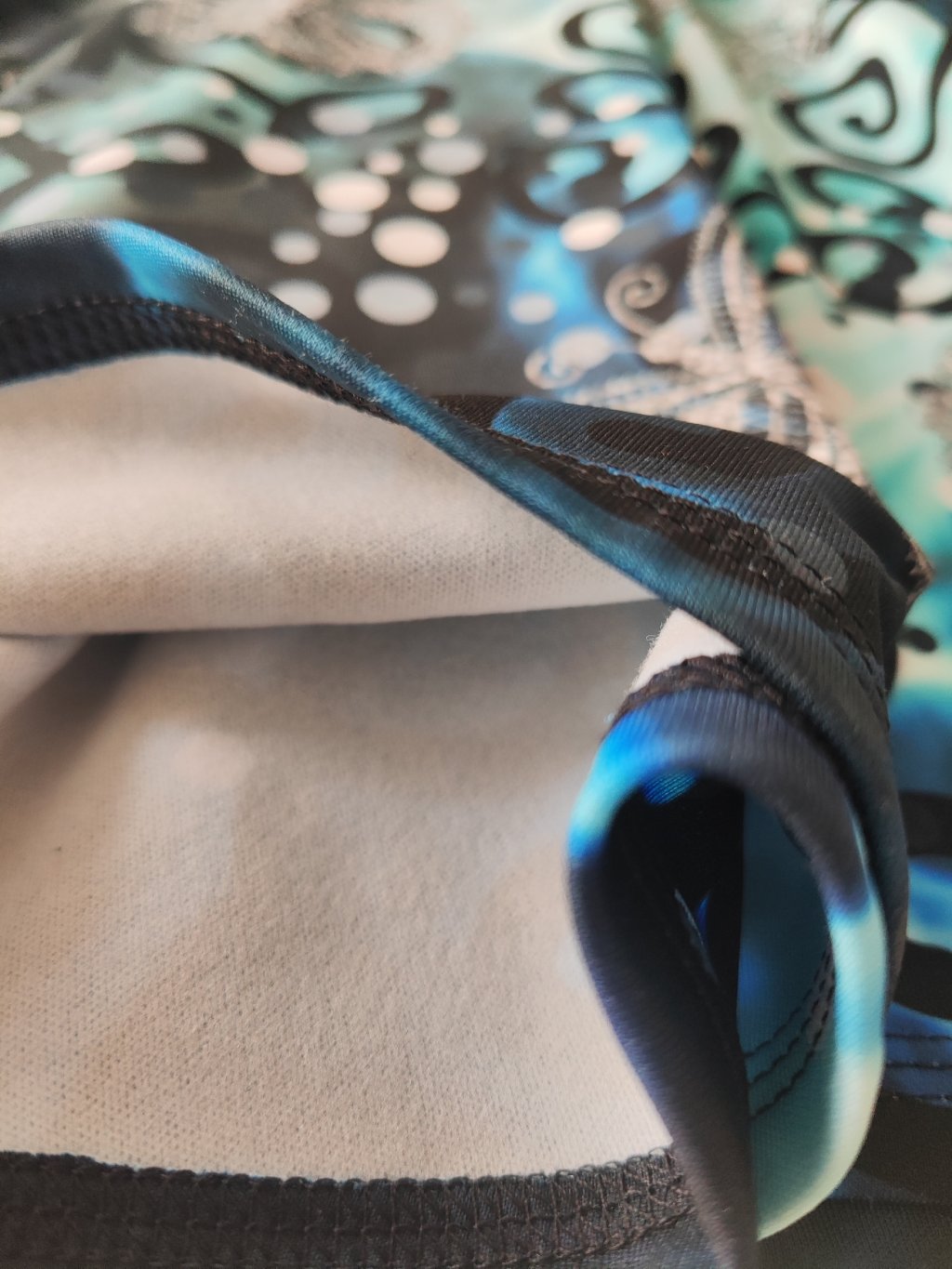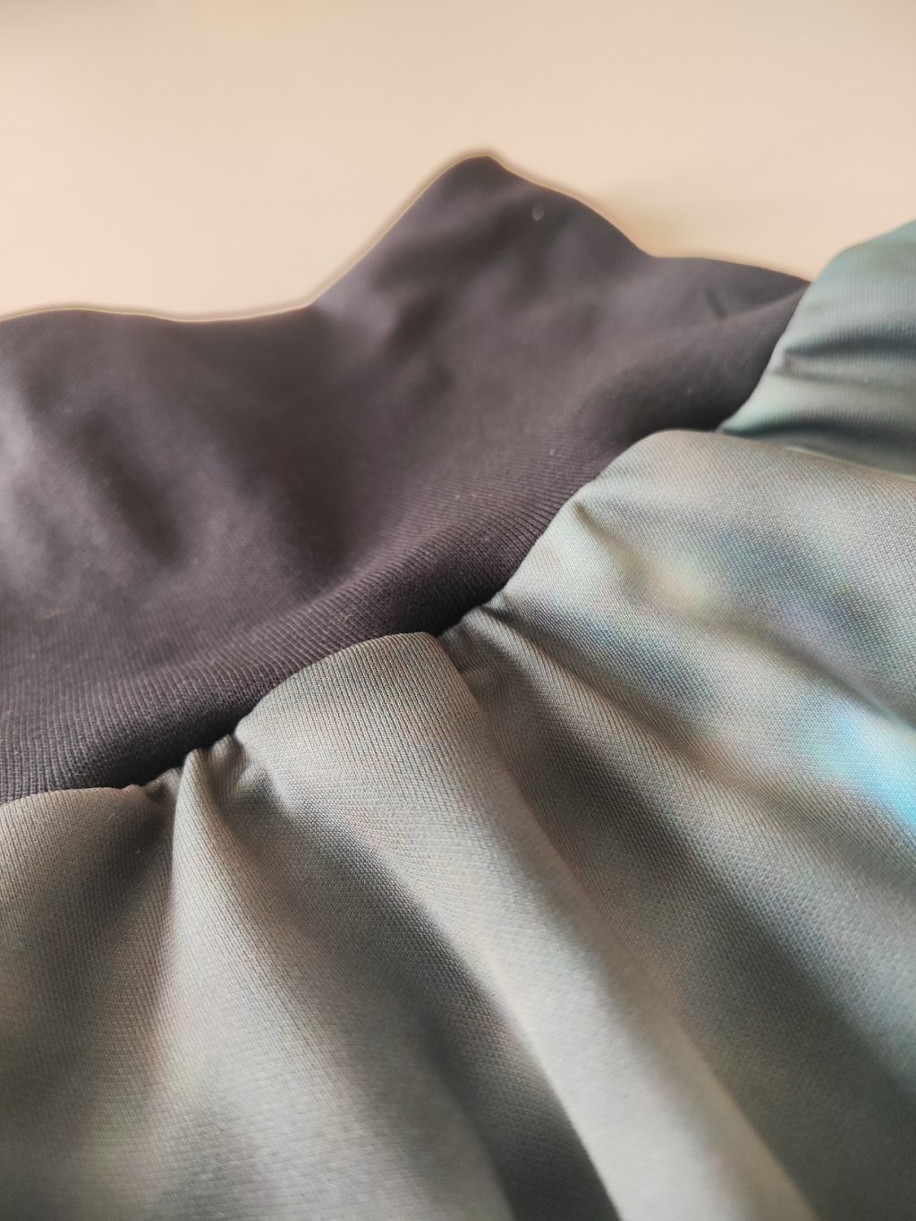 Materiál na sukni je pružný úplet: 92 % polyester/ 8% elastan. V rubu mírně počesaný.