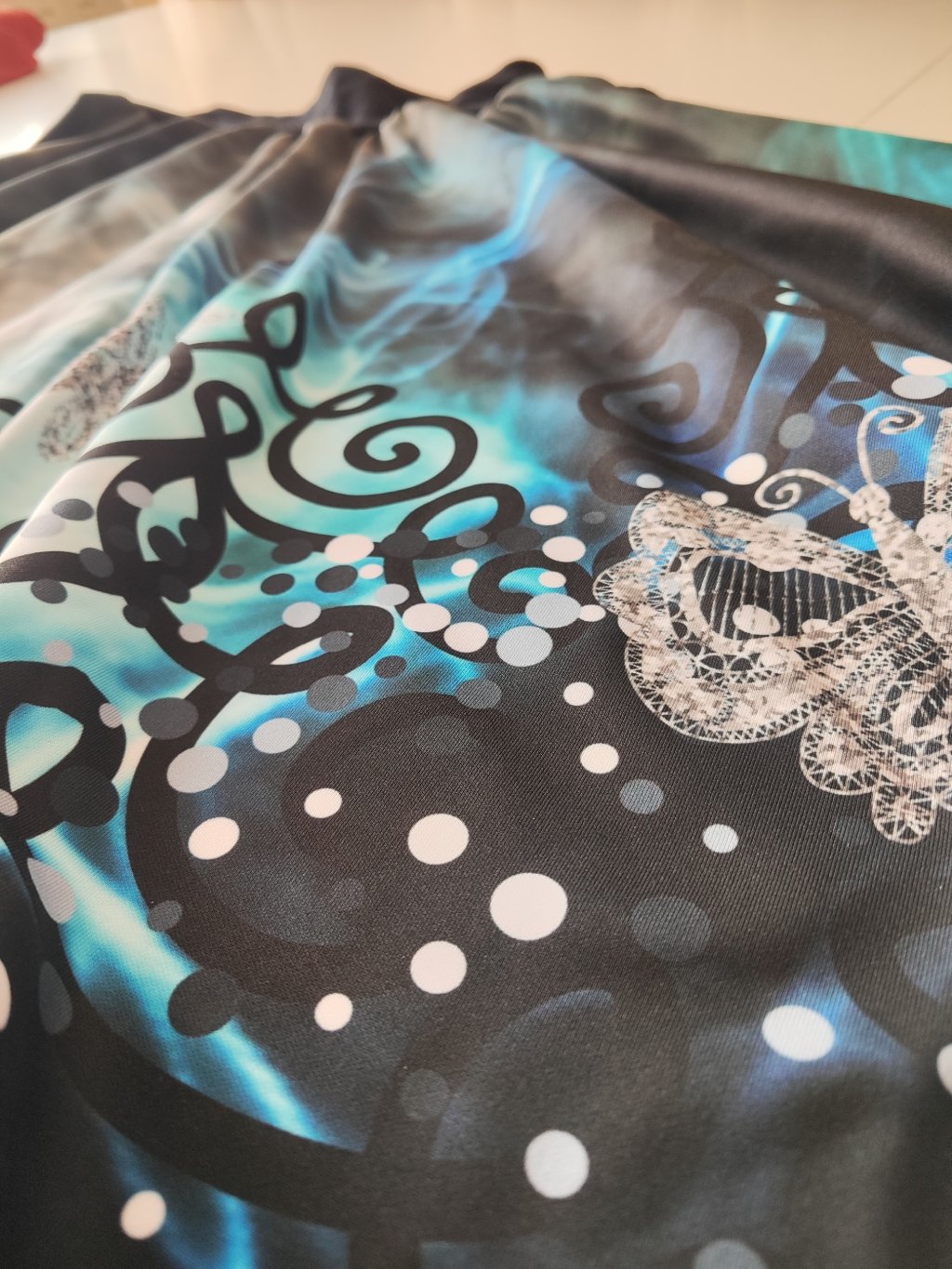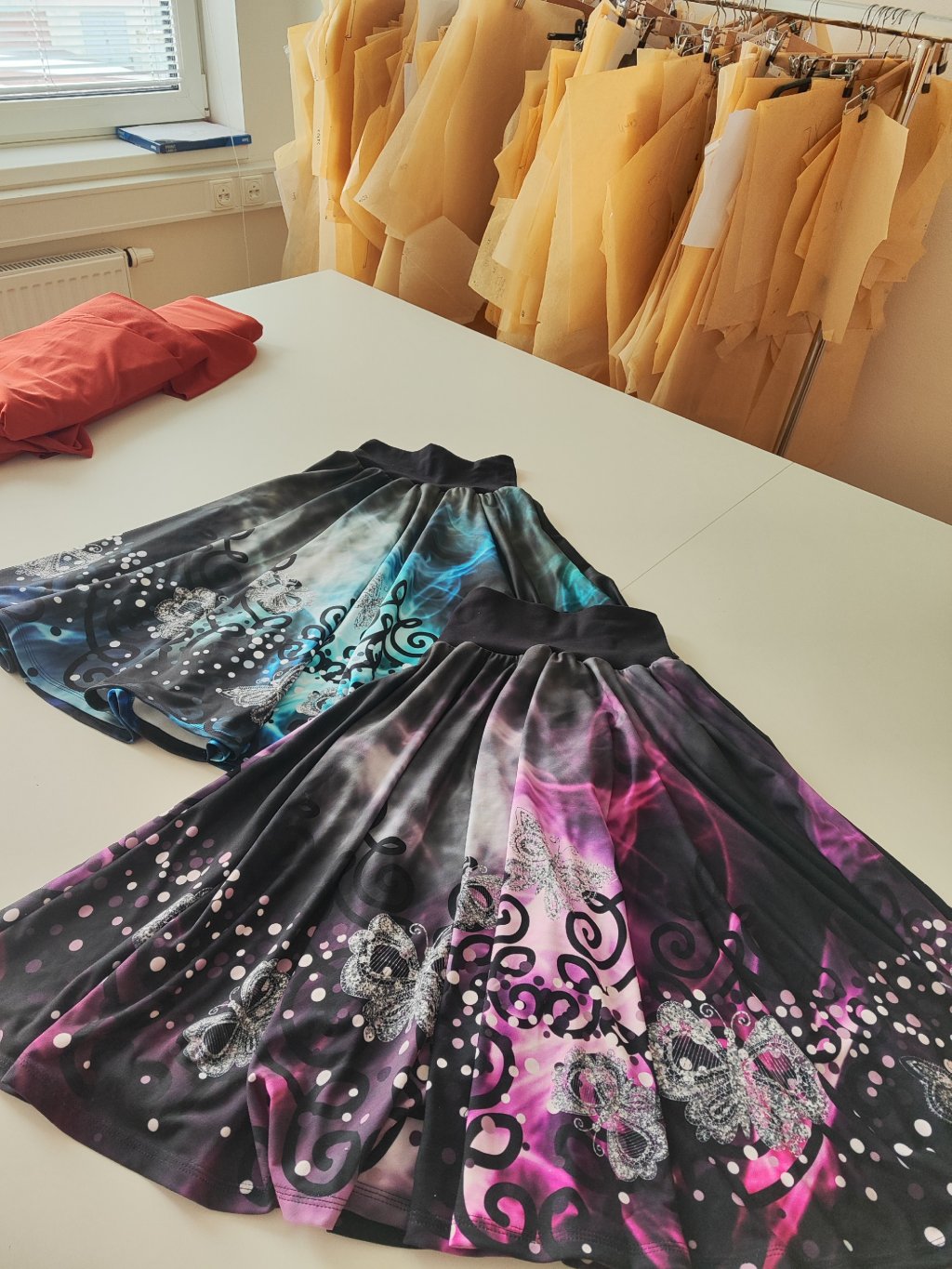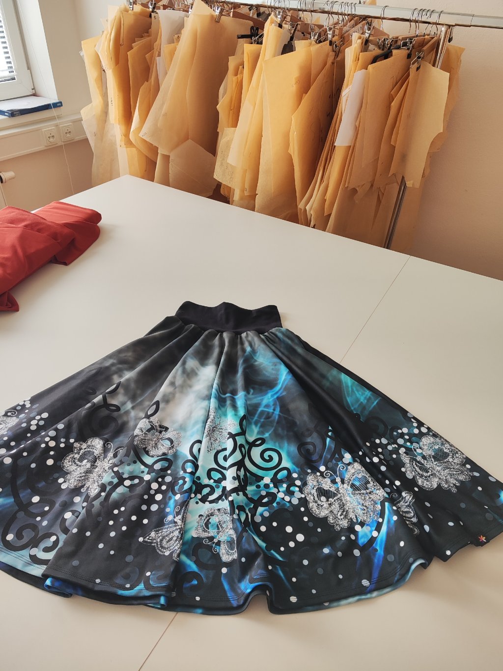 Sukně je kolová, bohatě se vlní. Sukně se nosí v pase nebo na bocích. V pase je pohodlný černý úplet.