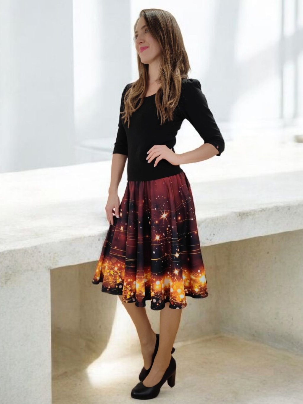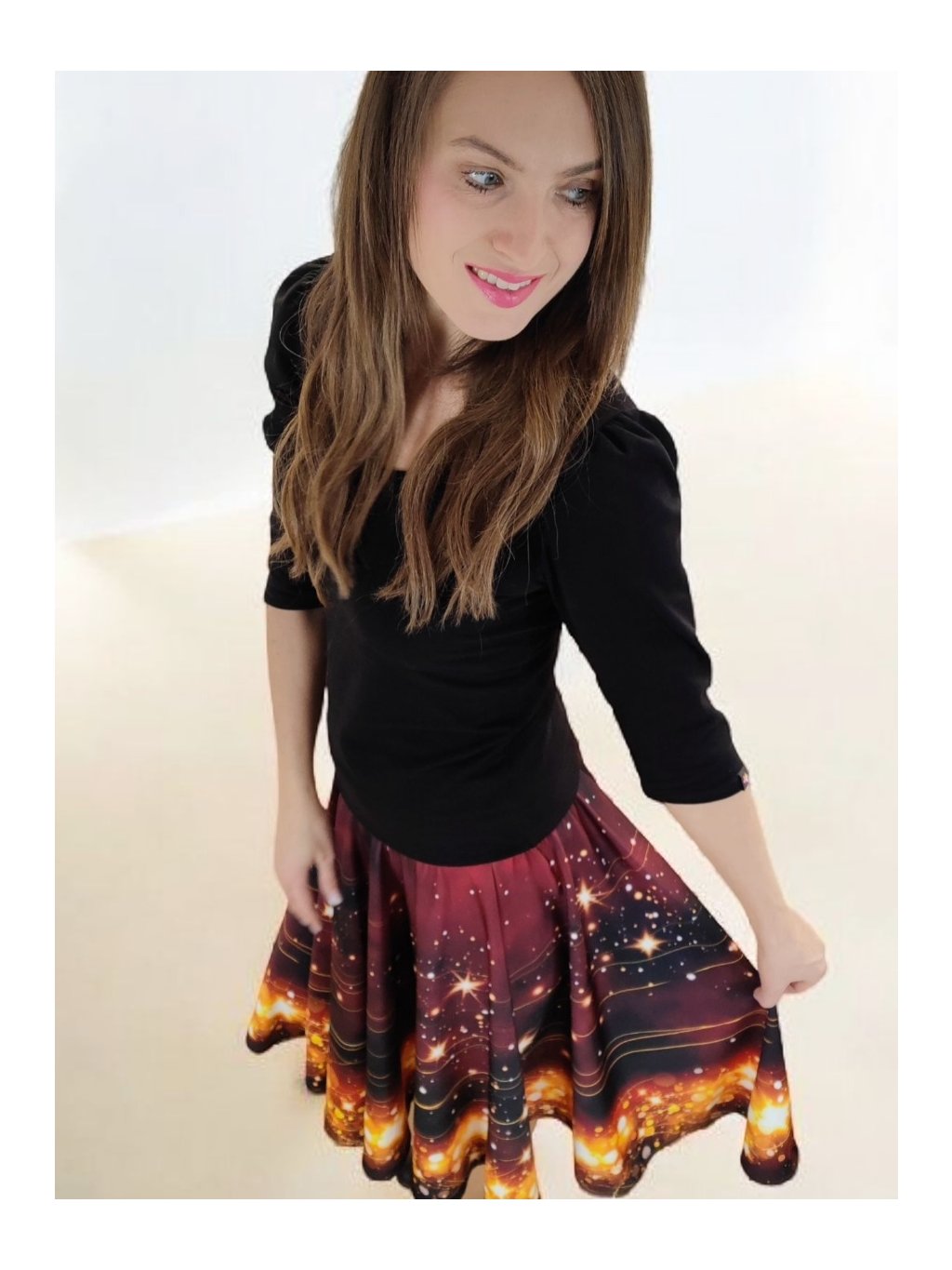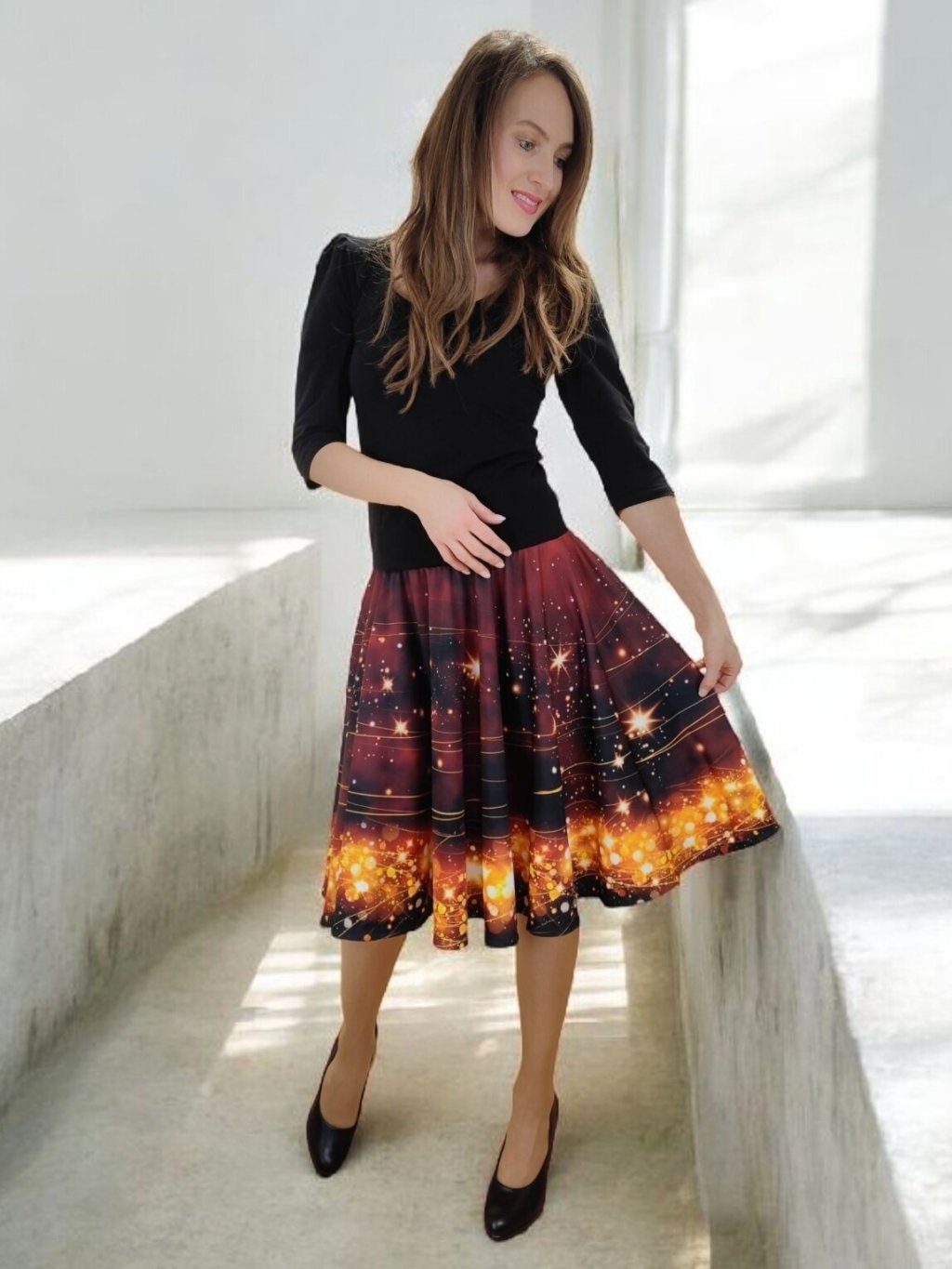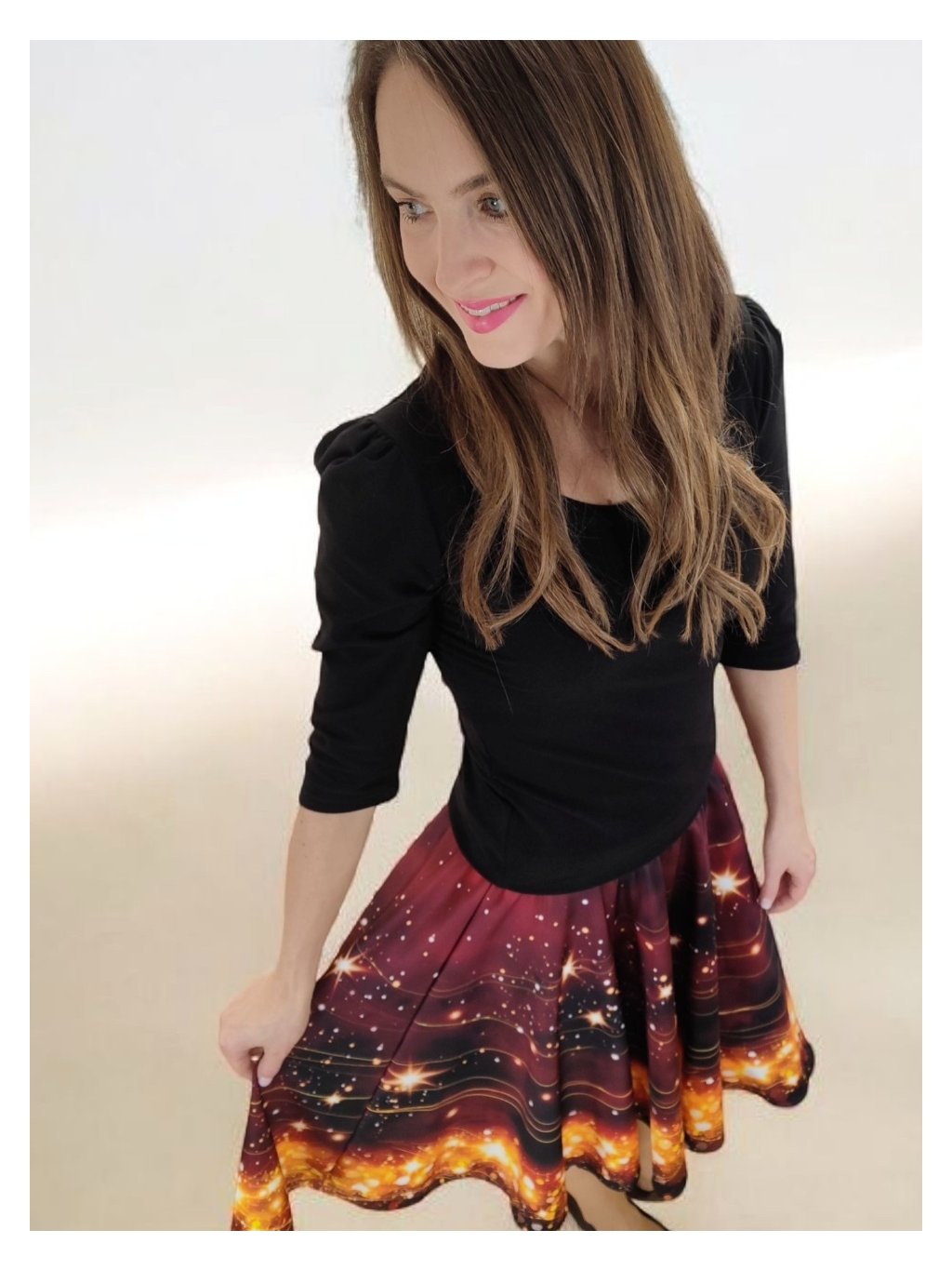 Barva sukně připomíná vánoční večer u svíček – hluboký tón vína se zrcadlí se zlatými hvězdami, které se třpytí jako drobná světélka na sněhu. Celek působí hřejivě, slavnostně a přitom jemně.