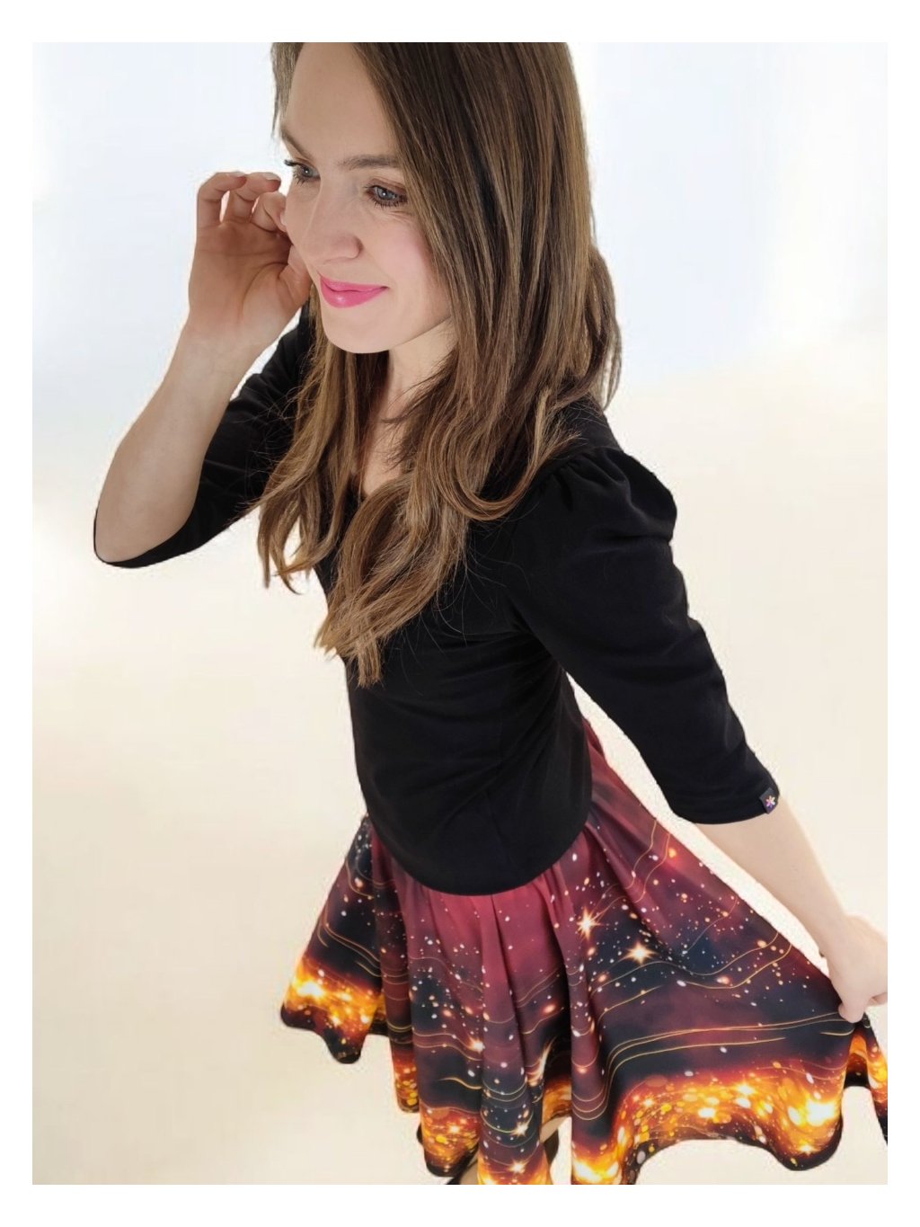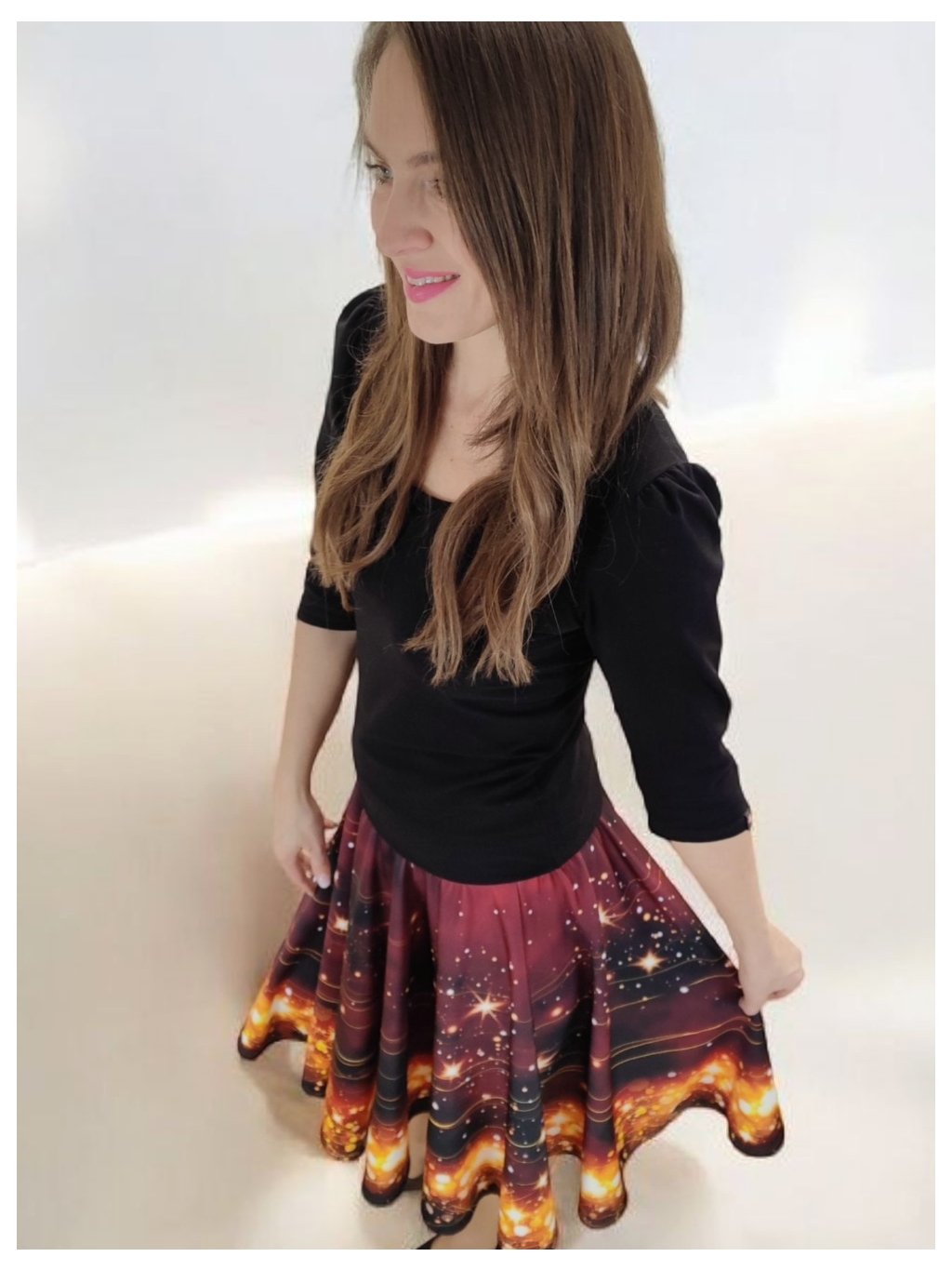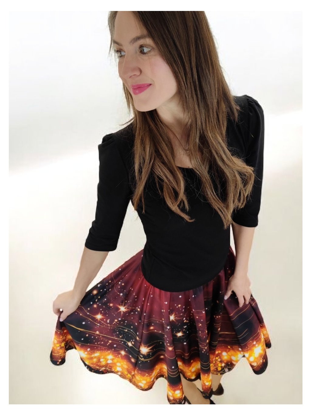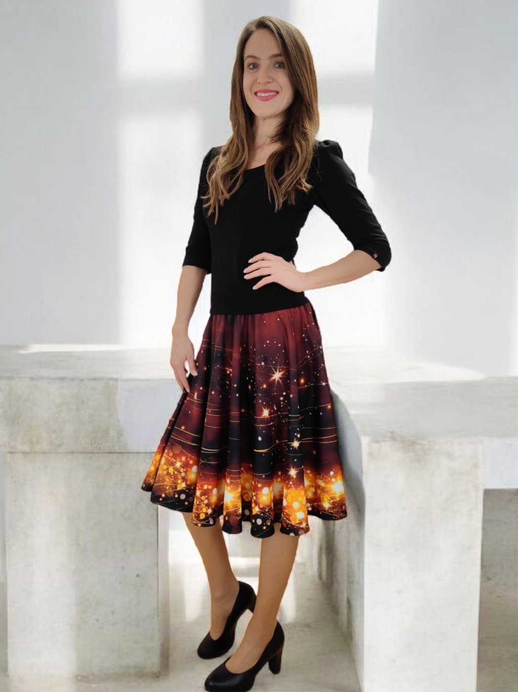 Barva sukně připomíná vánoční večer u svíček – hluboký tón vína se zrcadlí se zlatými hvězdami, které se třpytí jako drobná světélka na sněhu. Celek působí hřejivě, slavnostně a přitom jemně.
