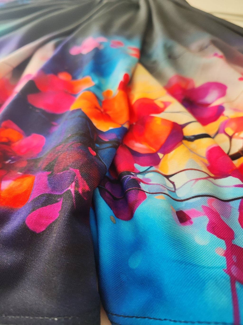Odstín Večerní zahrada připomíná tajemný soumrak, kdy se květy v zahradě zbarvují do temně modrých, červených a oranžových tónů. Působí jako malba, která v sobě nese jak vášeň, tak klid večerní chvíle. Vzor je výrazný a elegantní, takže krásně vynikne při každém kroku.
