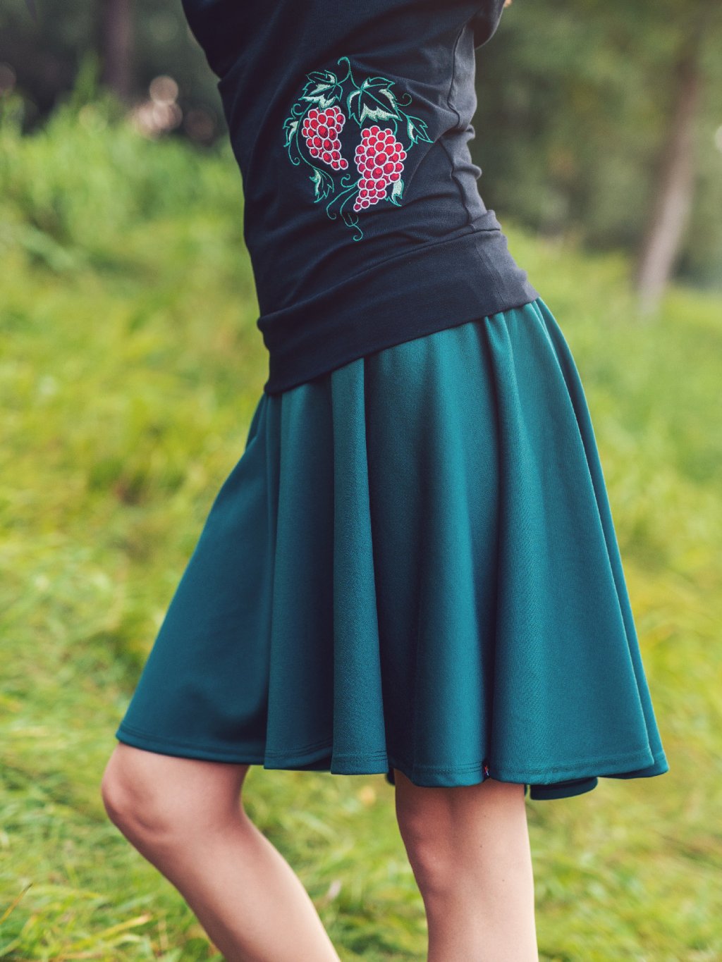 Sukně je kolová, rozšiřuje se k dolnímu kraji a vlní se.