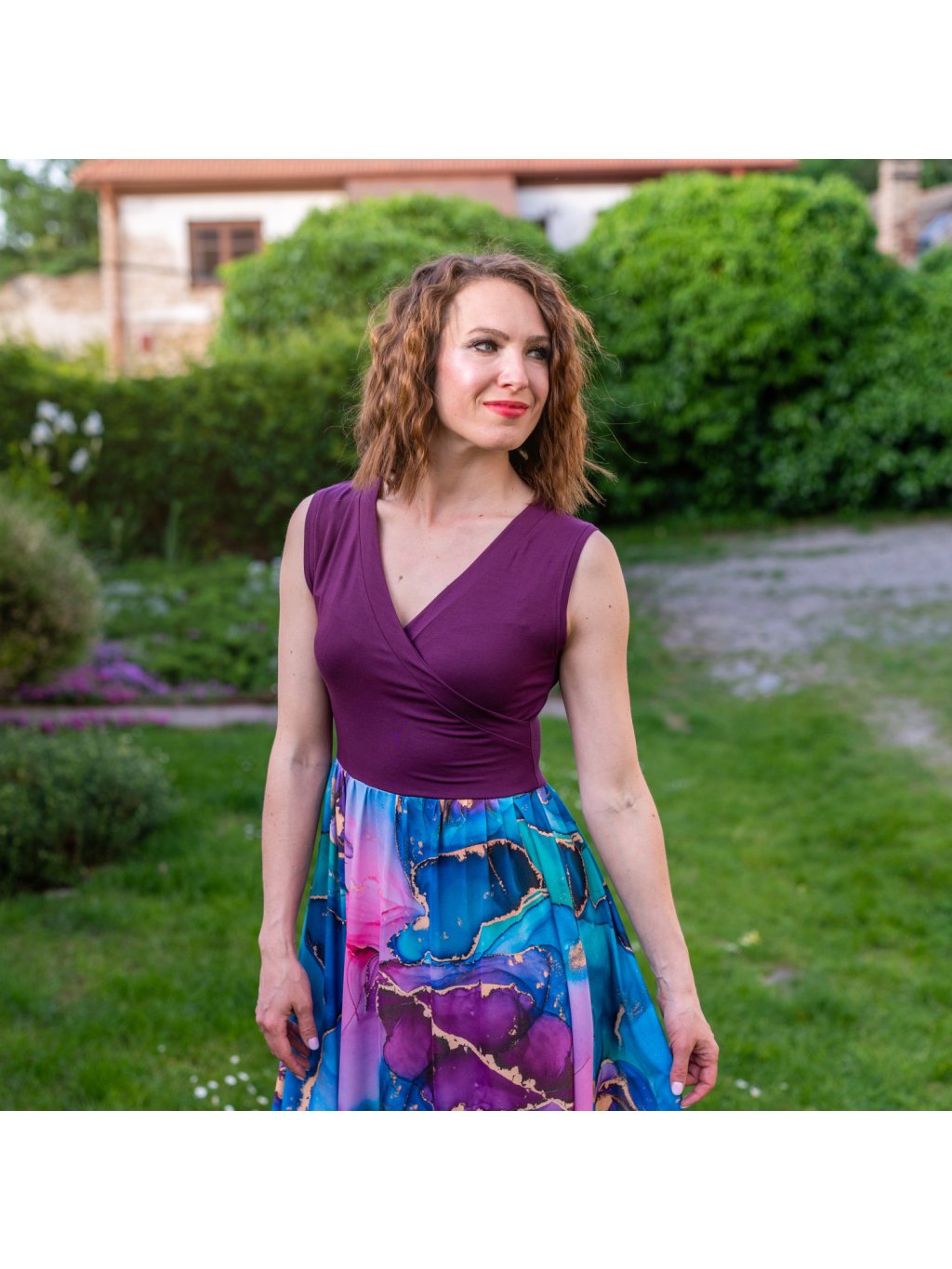 Vrchní část šatů je z materiálu Modal - fialová barva. Modal (Tencel) vyniká řadou svých vlastností - je prodyšný, příjemný na nošení, stálobarevný.