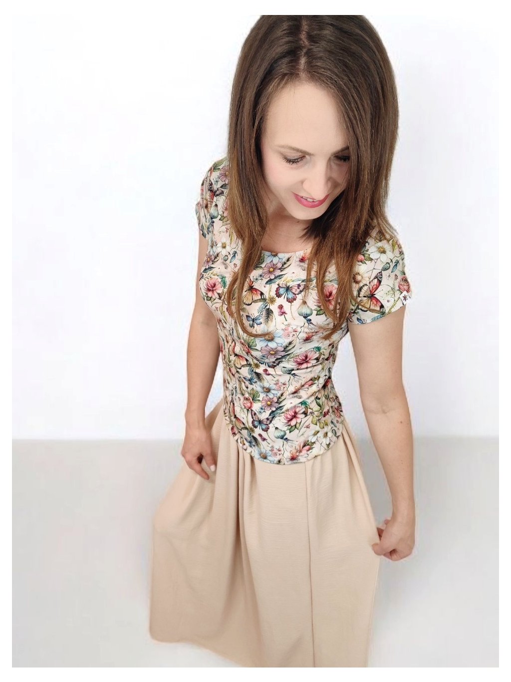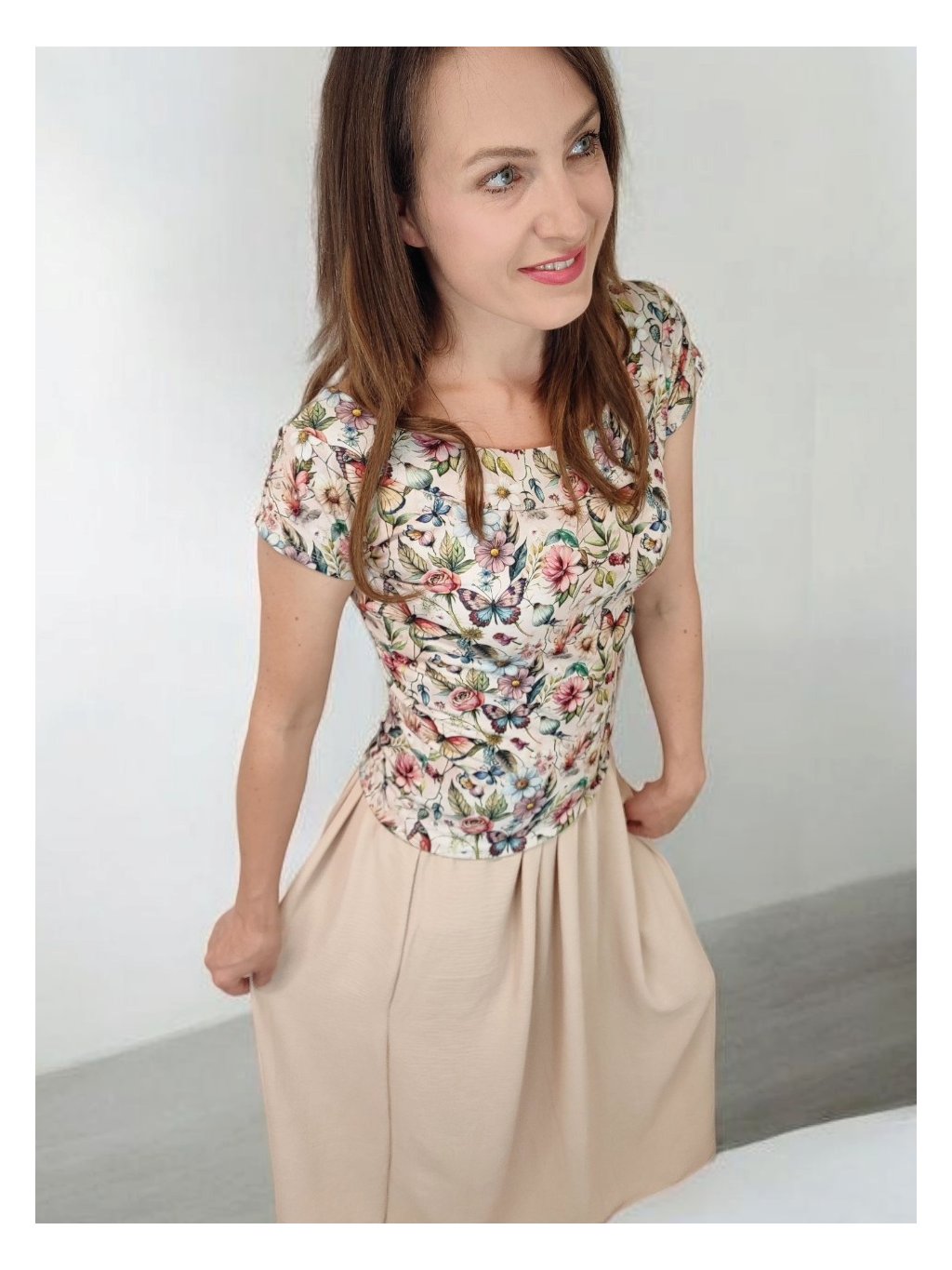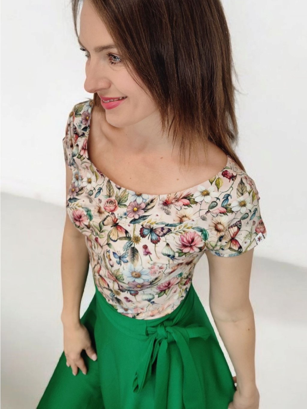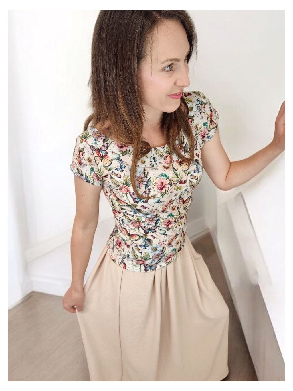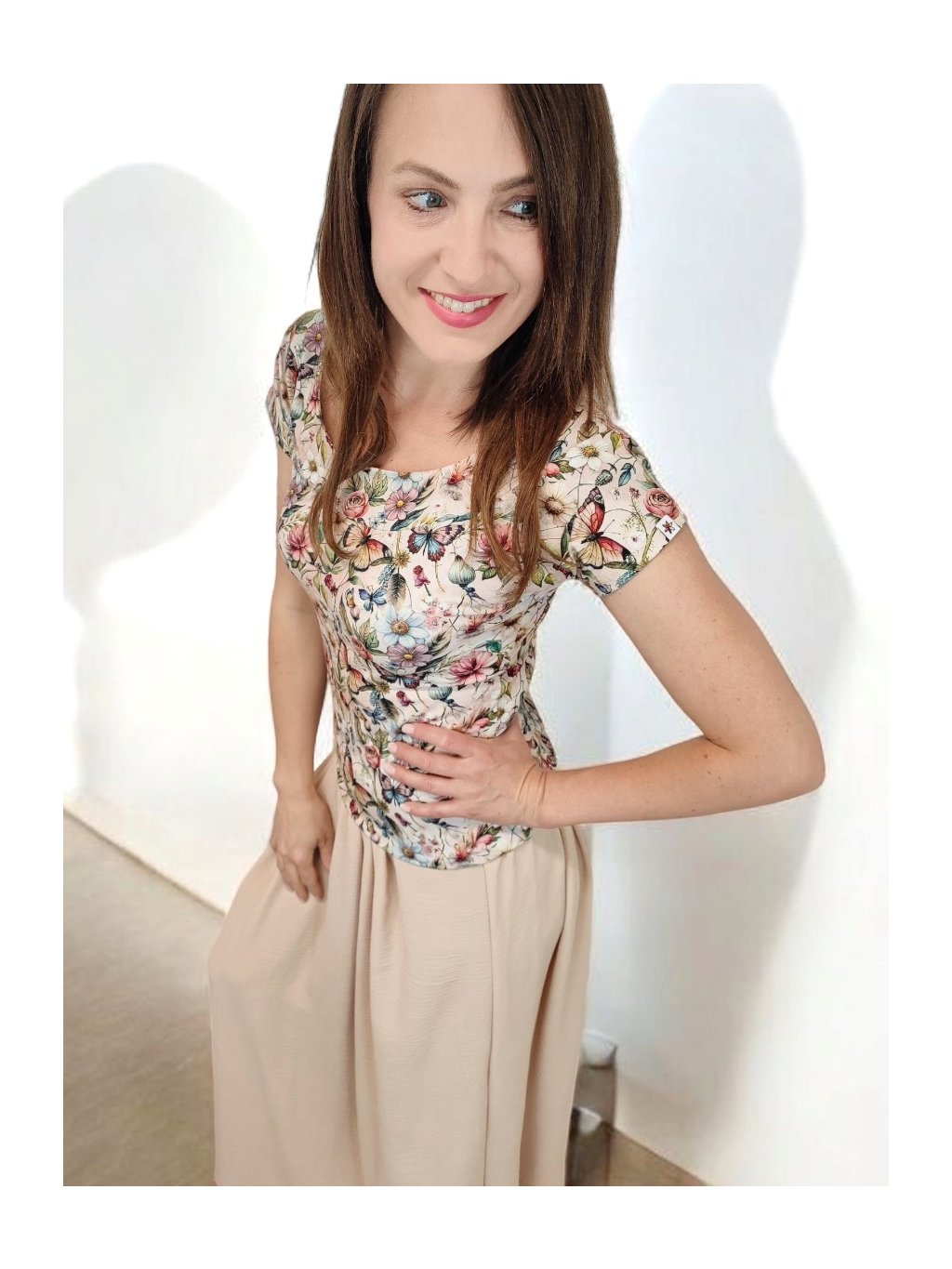 Tričko Lela je jako stvořené pro letní dny – lehké, vzdušné a pohodlné. Lodičkový výstřih jemně odhalí linii klíčních kostí a dodá elegantní nádech. Krátké rukávy a projmutý střih krásně sedí a lichotí ženské postavě, aniž by omezovaly pohyb. Květinový vzor v pastelových barvách působí romanticky, a přitom svěže. Tričko šijeme v našem českém ateliéru z kvalitního bavlněného úpletu s elastanem a rády ho přizpůsobíme na míru. Perfektní k sukním i kalhotám, do práce i na výlet.