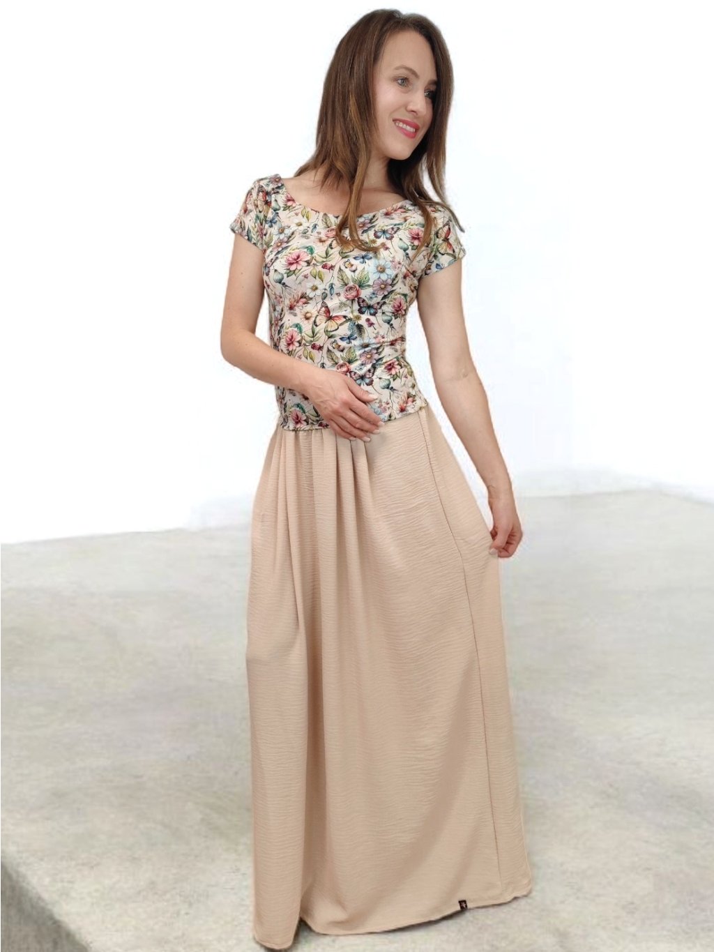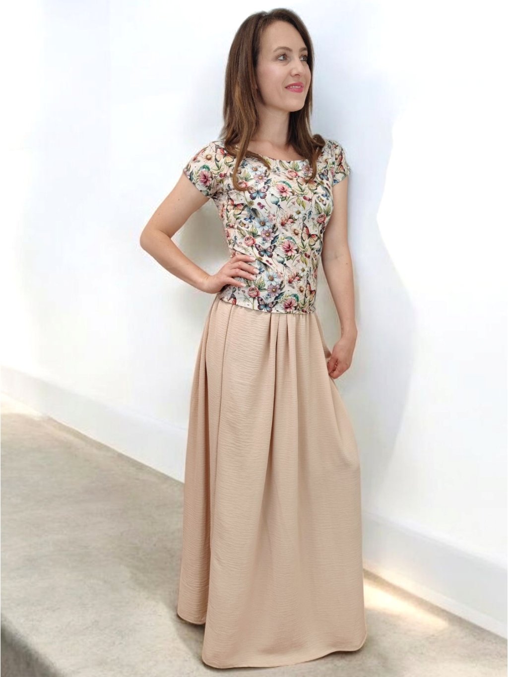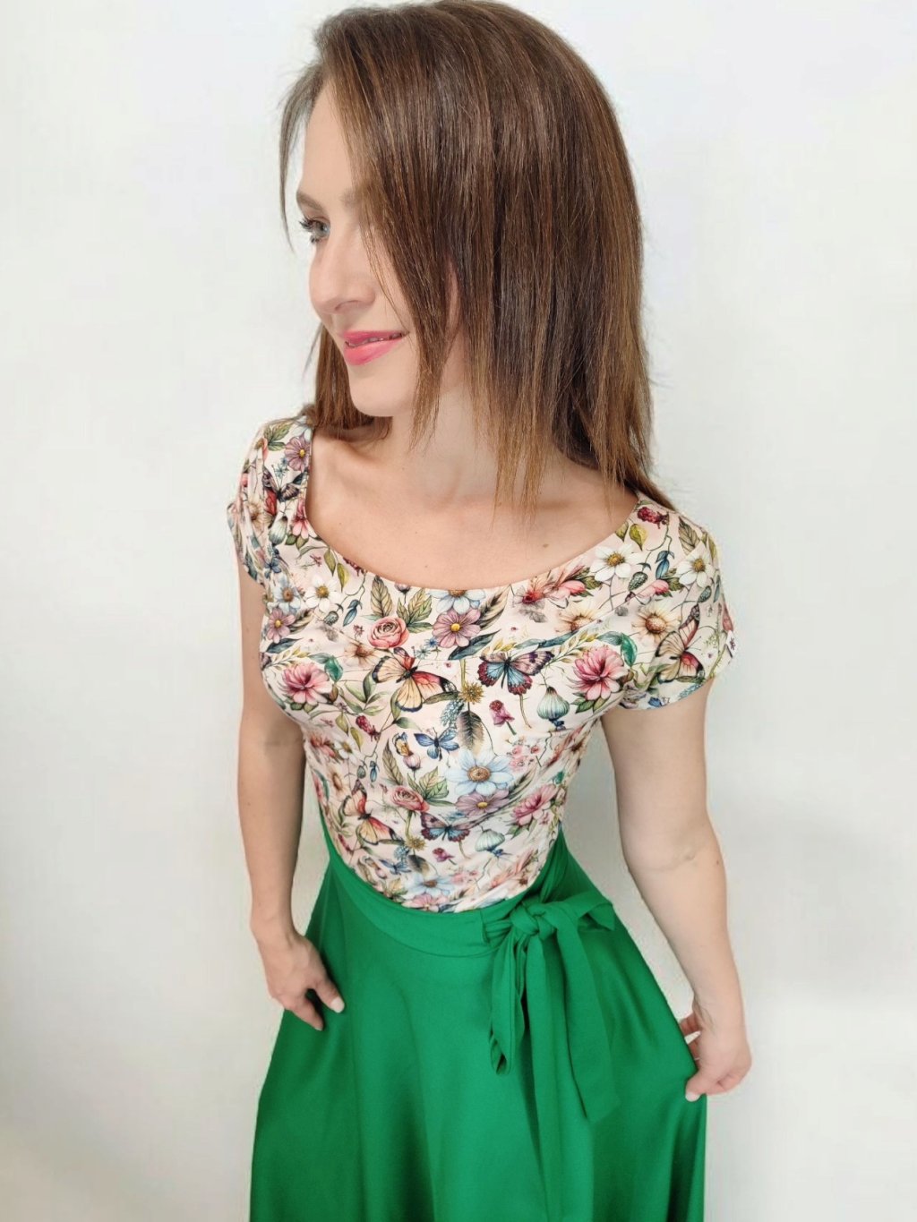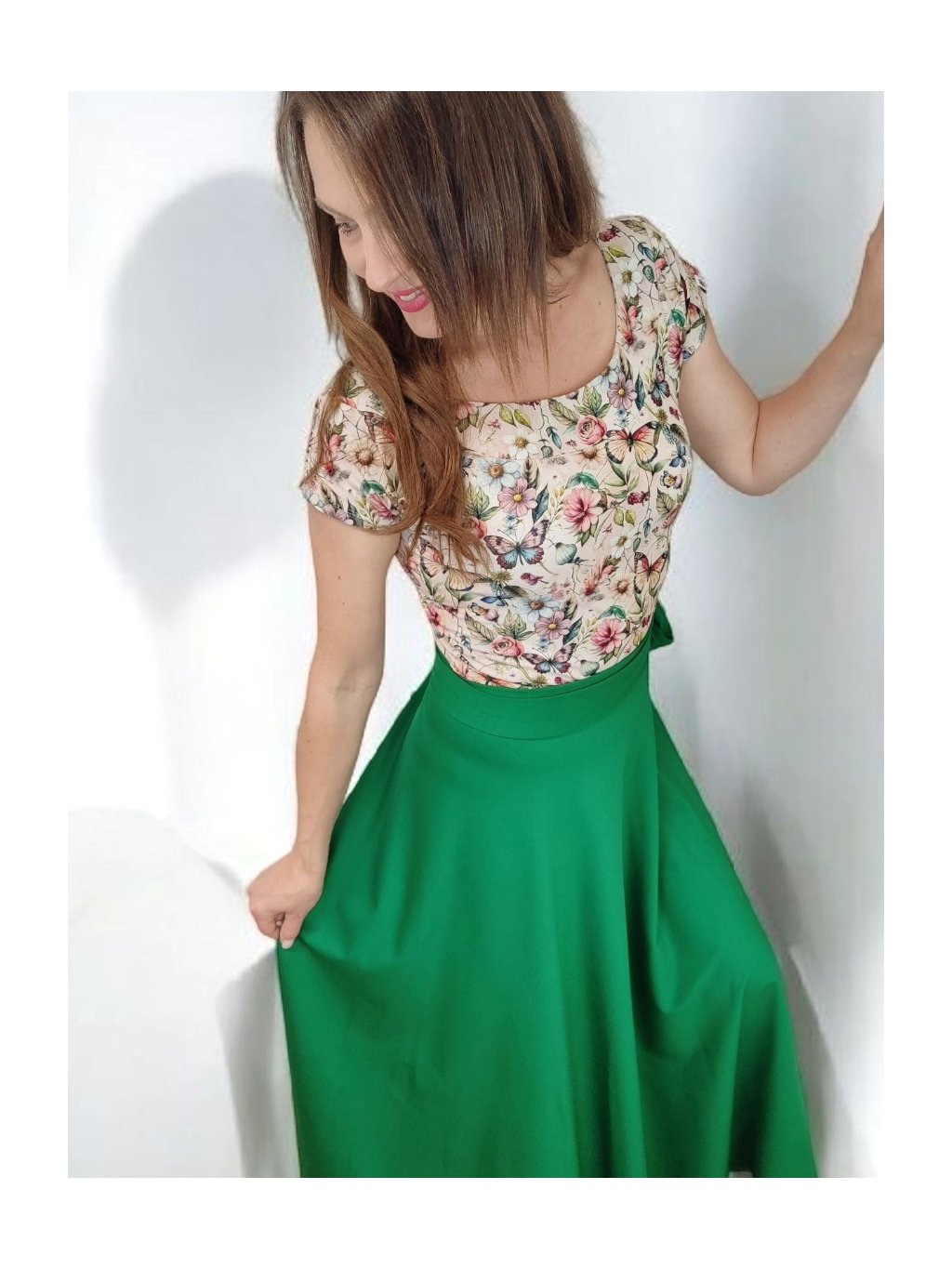 Tričko Lela je jako stvořené pro letní dny – lehké, vzdušné a pohodlné. Lodičkový výstřih jemně odhalí linii klíčních kostí a dodá elegantní nádech. Krátké rukávy a projmutý střih krásně sedí a lichotí ženské postavě, aniž by omezovaly pohyb. Květinový vzor v pastelových barvách působí romanticky, a přitom svěže. Tričko šijeme v našem českém ateliéru z kvalitního bavlněného úpletu s elastanem a rády ho přizpůsobíme na míru. Perfektní k sukním i kalhotám, do práce i na výlet.