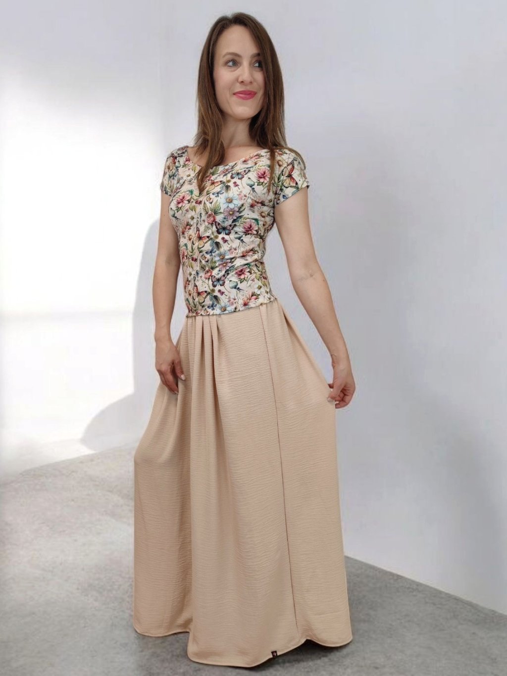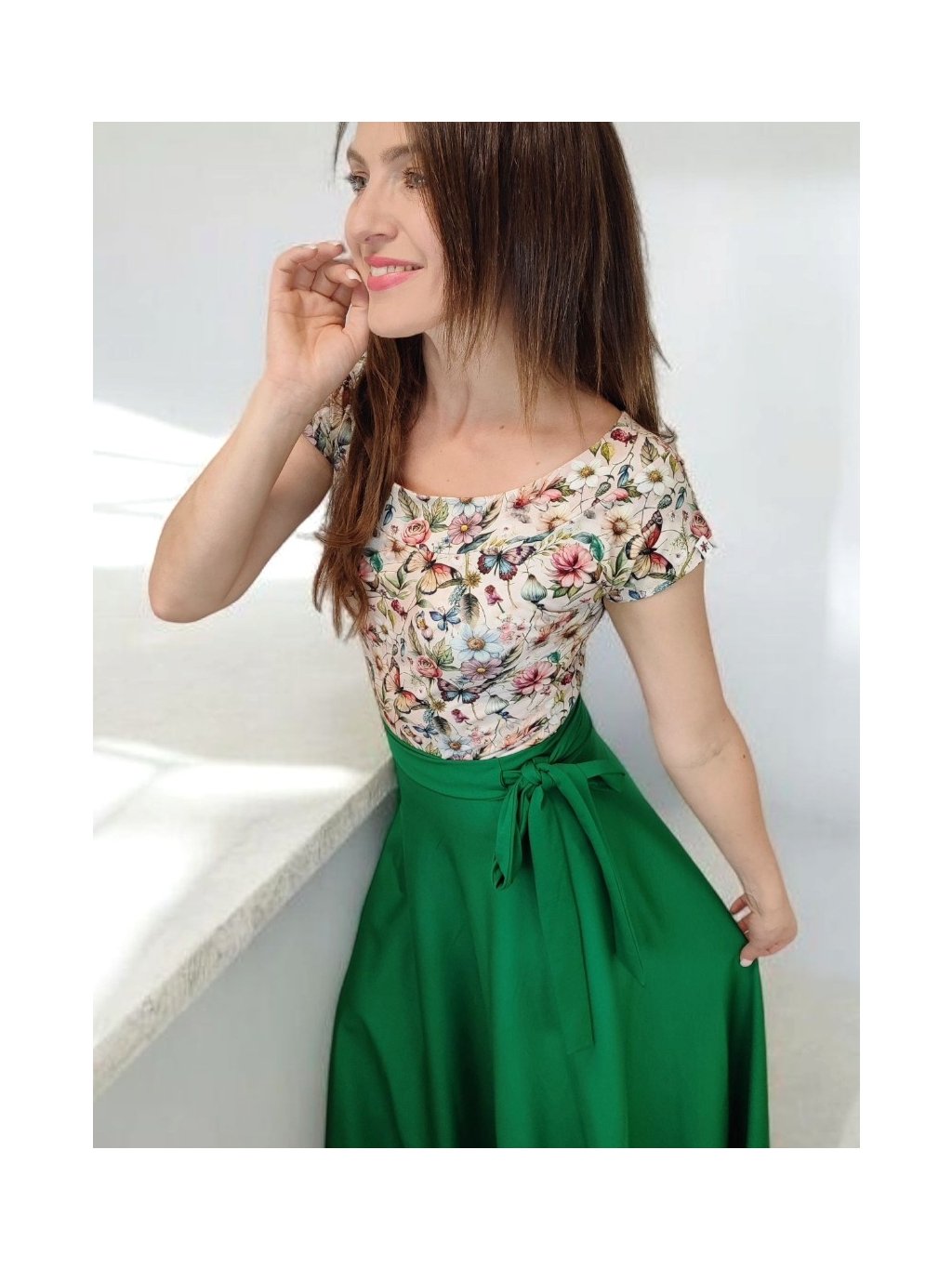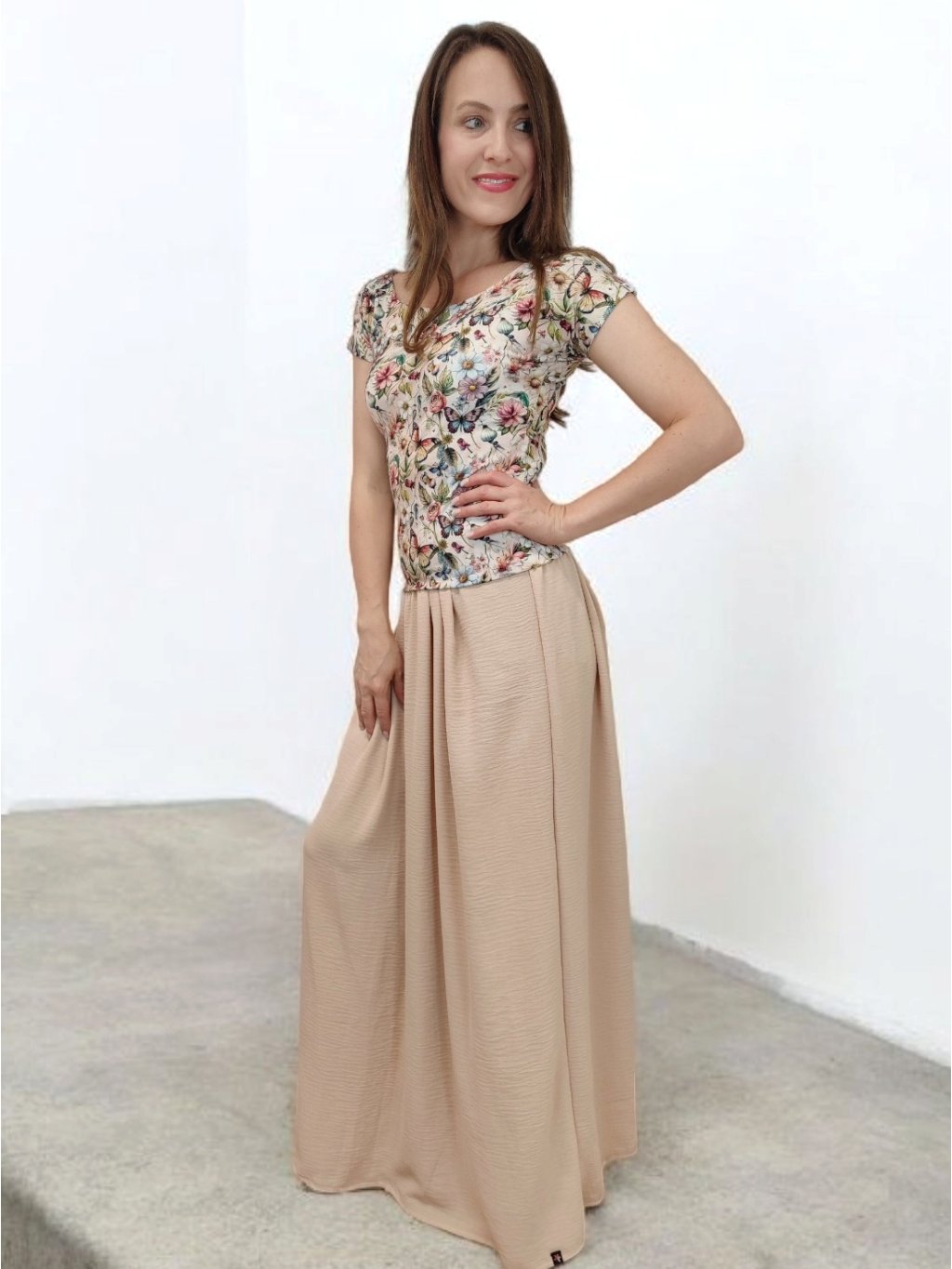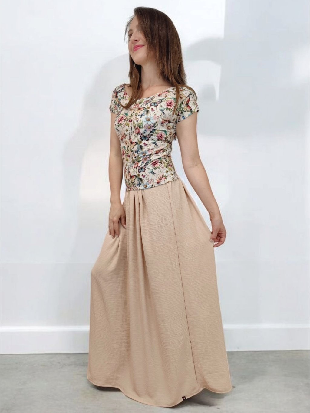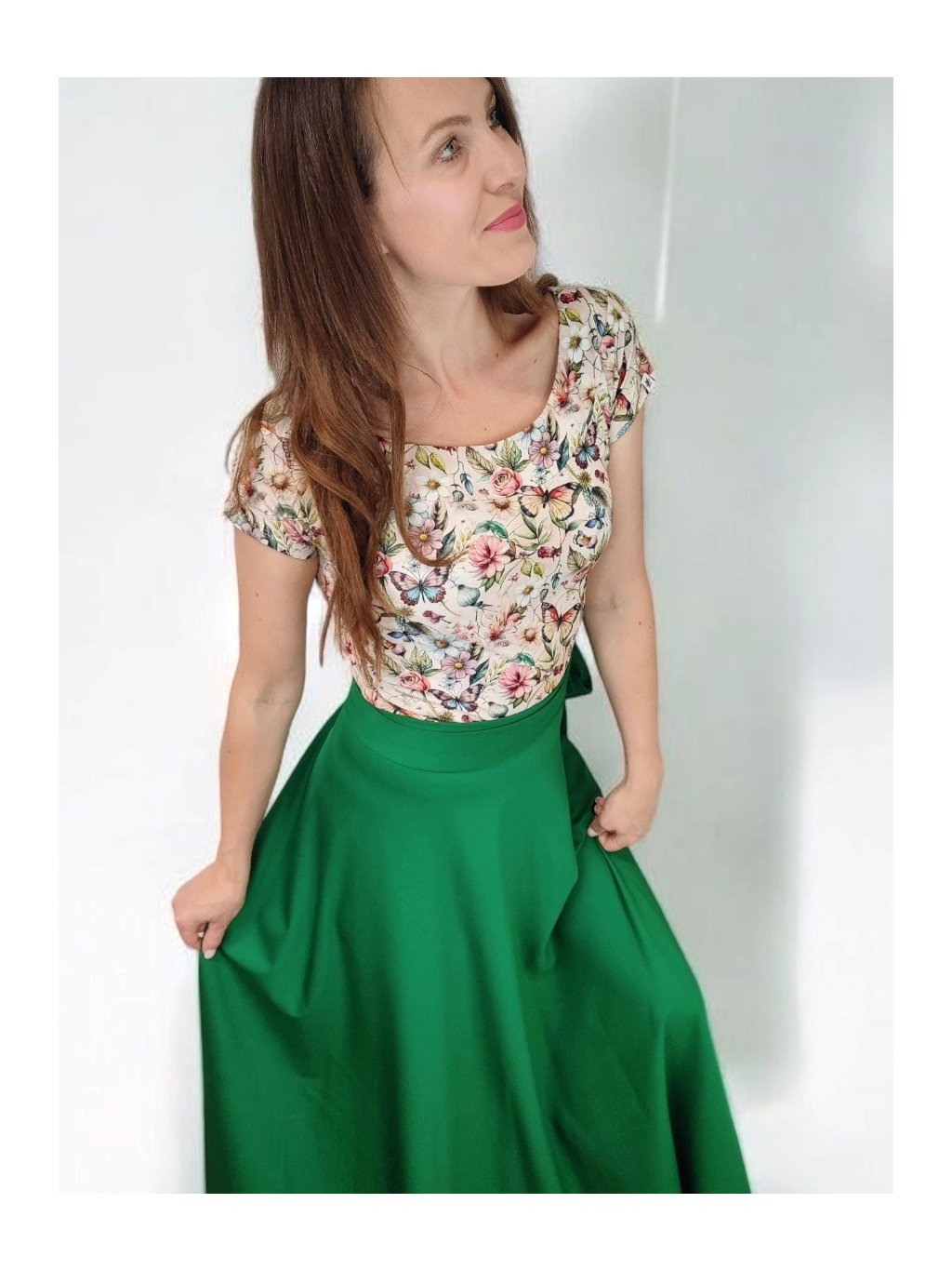 Tričko Lela je jako stvořené pro letní dny – lehké, vzdušné a pohodlné. Lodičkový výstřih jemně odhalí linii klíčních kostí a dodá elegantní nádech. Krátké rukávy a projmutý střih krásně sedí a lichotí ženské postavě, aniž by omezovaly pohyb. Květinový vzor v pastelových barvách působí romanticky, a přitom svěže. Tričko šijeme v našem českém ateliéru z kvalitního bavlněného úpletu s elastanem a rády ho přizpůsobíme na míru. Perfektní k sukním i kalhotám, do práce i na výlet.
