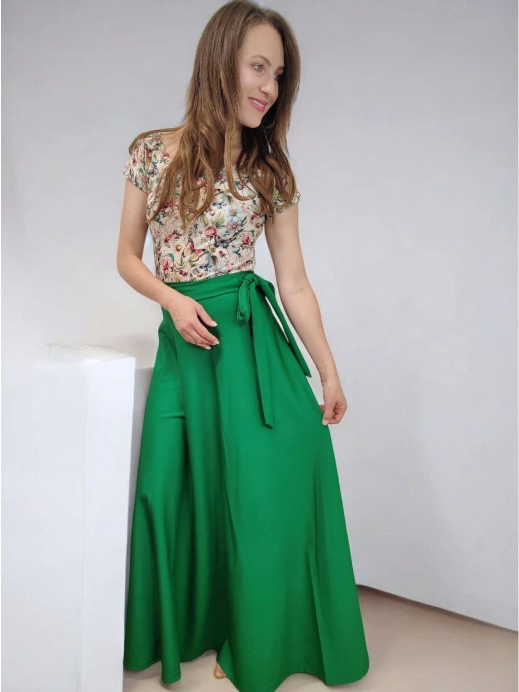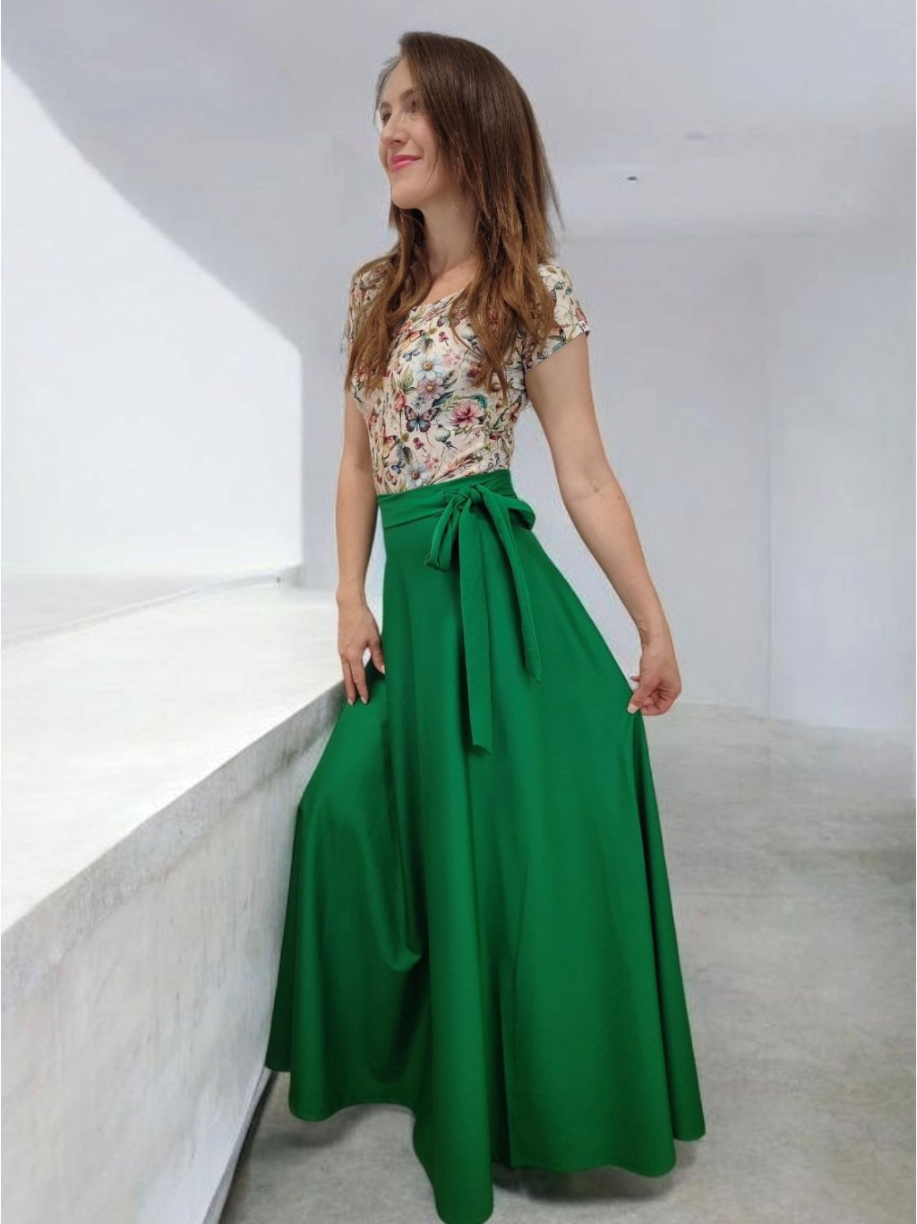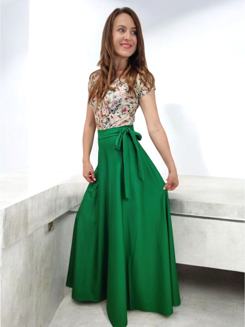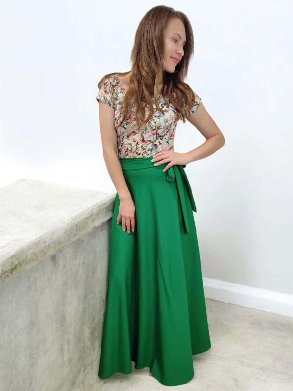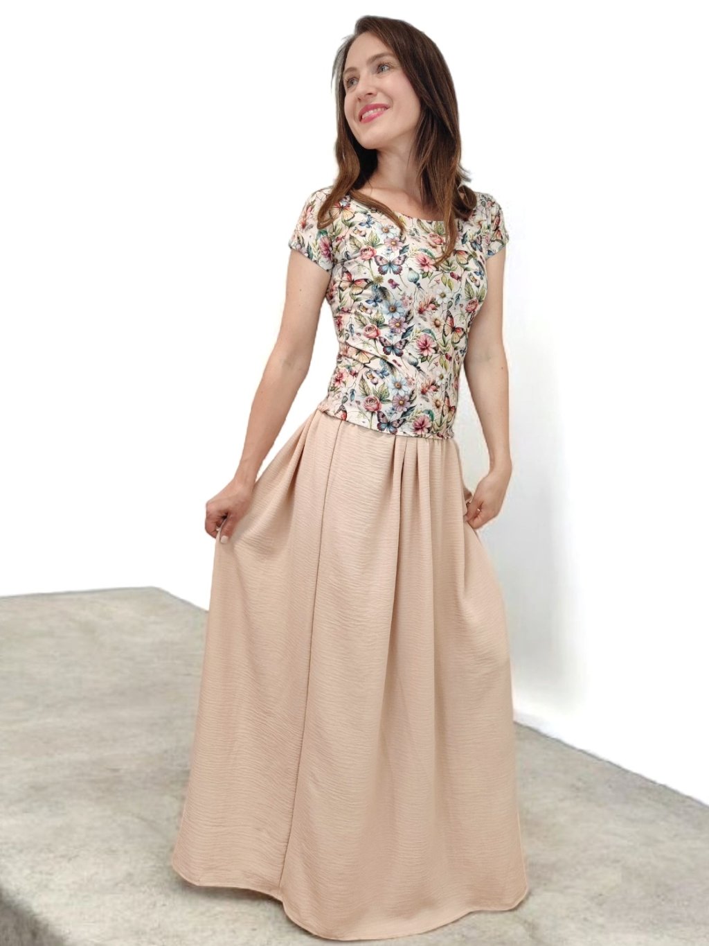 Tričko Lela je jako stvořené pro letní dny – lehké, vzdušné a pohodlné. Lodičkový výstřih jemně odhalí linii klíčních kostí a dodá elegantní nádech. Krátké rukávy a projmutý střih krásně sedí a lichotí ženské postavě, aniž by omezovaly pohyb. Květinový vzor v pastelových barvách působí romanticky, a přitom svěže. Tričko šijeme v našem českém ateliéru z kvalitního bavlněného úpletu s elastanem a rády ho přizpůsobíme na míru. Perfektní k sukním i kalhotám, do práce i na výlet.