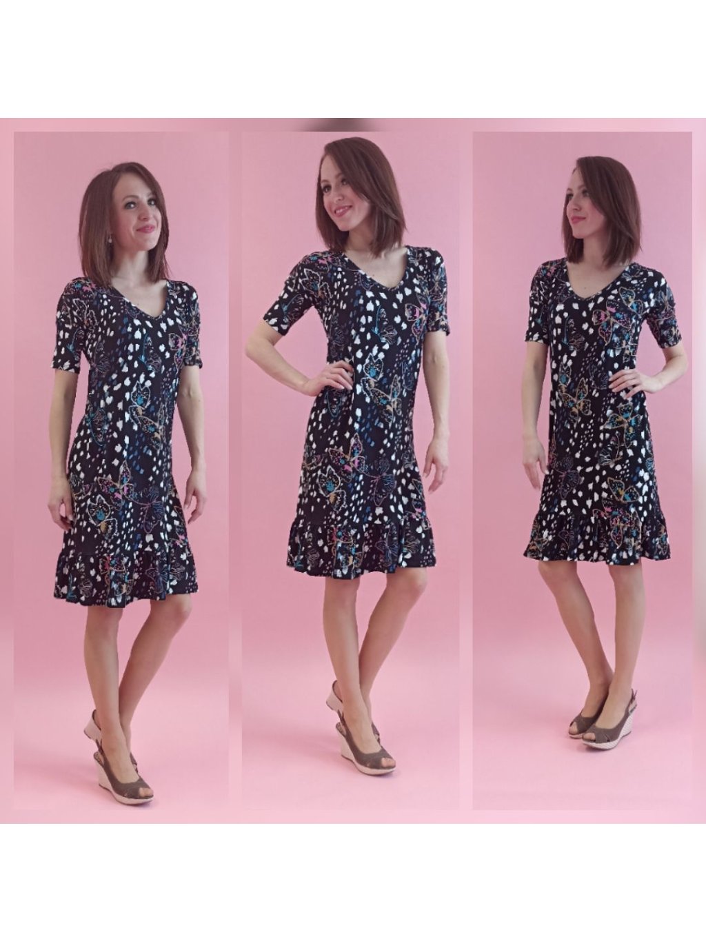 Letní šaty z viskozy s volánem CELESTE, 3/4 rukáv, výstřih do V, černé s motýlky