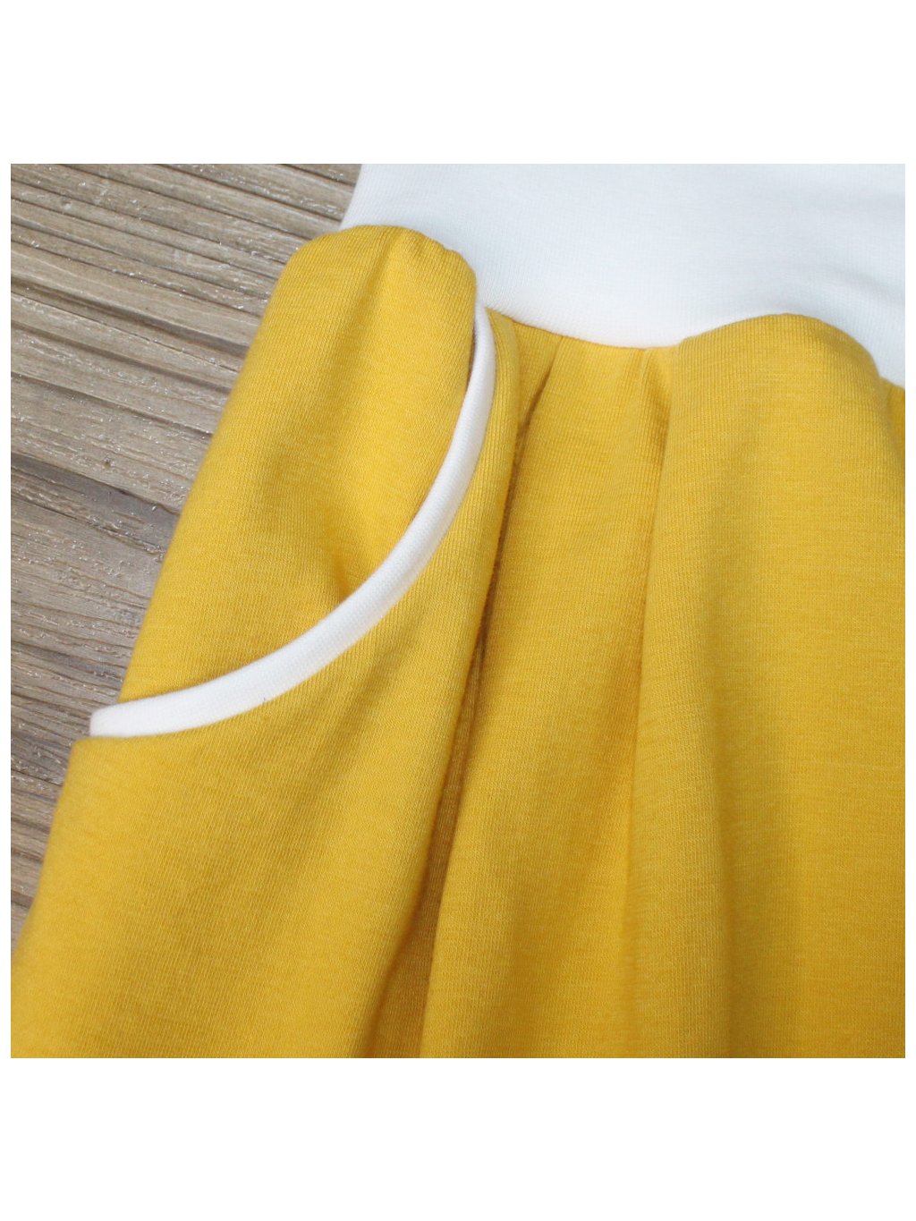 Sukně je střižena rovně, v pase 4 sklady. V bocích má sukně kapsy.