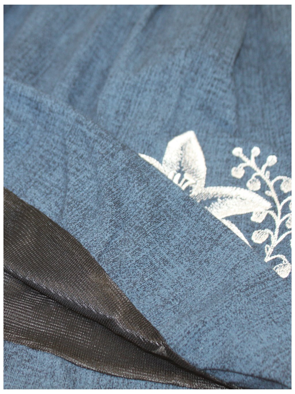 Modrá balonová sukně je vhodná na jaro. Na boku je výšivka bílých květů.