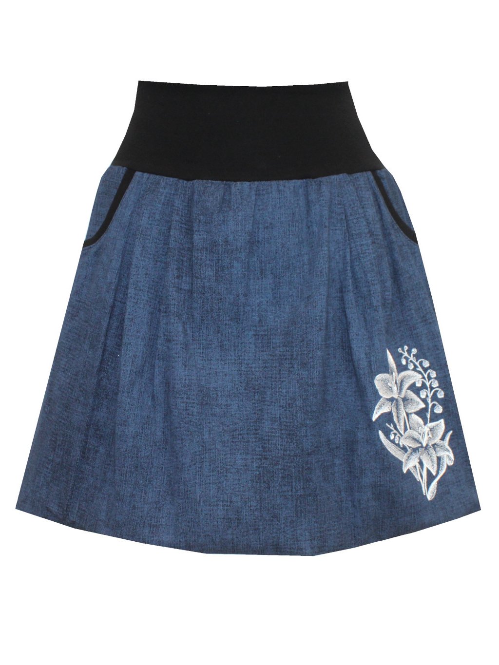 Modrá balonová sukně KATY, kapsy, imitace džínoviny, bílý květ