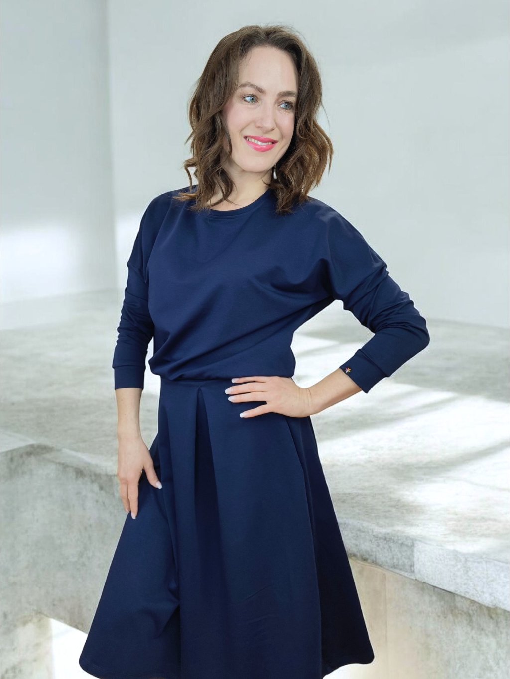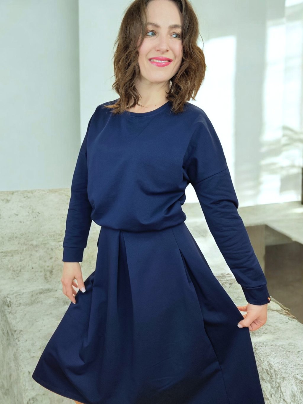 K této modré mikině šijeme také sukni ze stejného materiálu. Můžete si tak vytvořit set, komplet nebo matching set, který působí velmi moderně a uceleně.