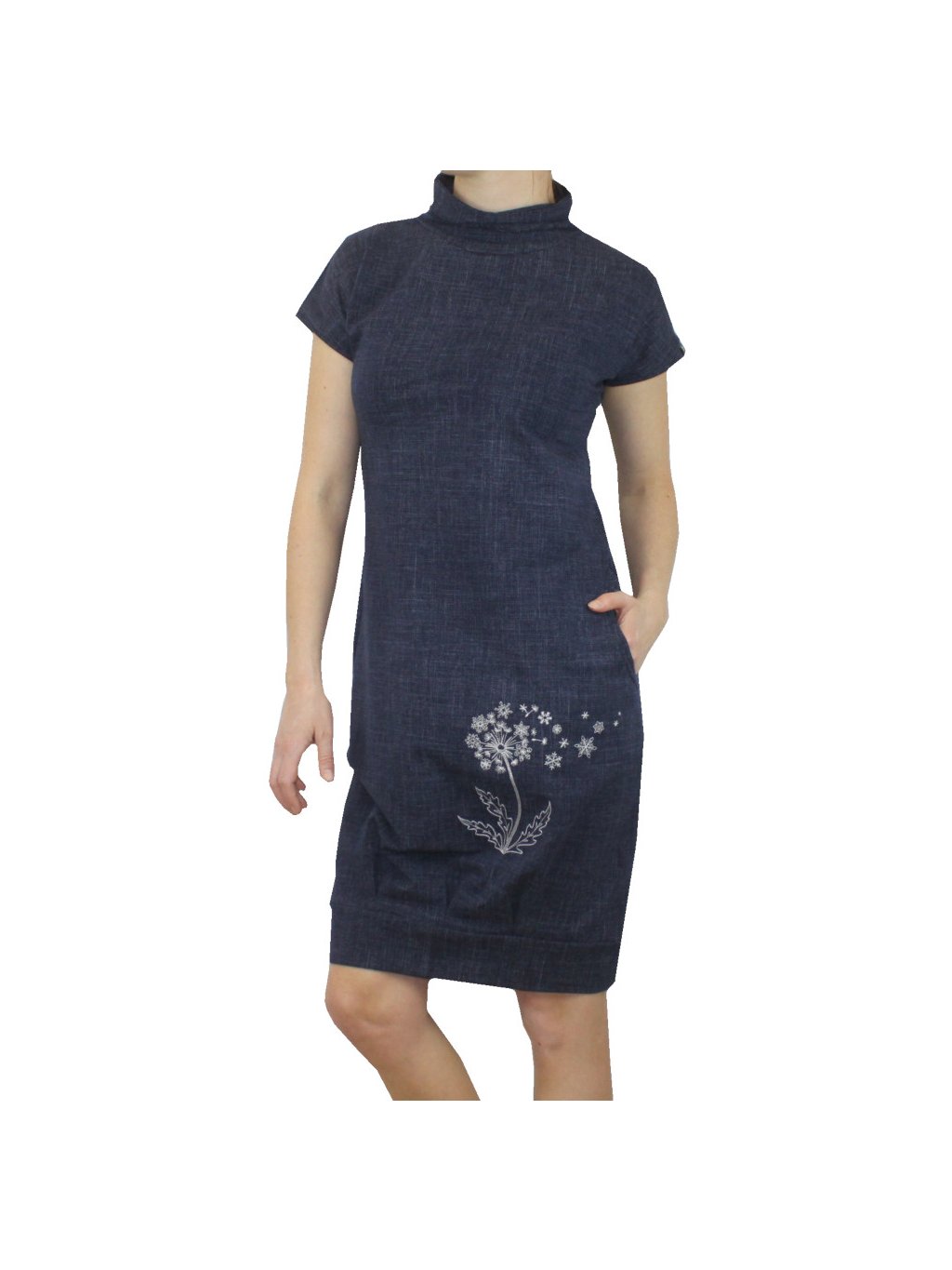 Modré dámské šaty, krátké rukávy, volnější balonkový střih, kapsy, zimní pampeliška