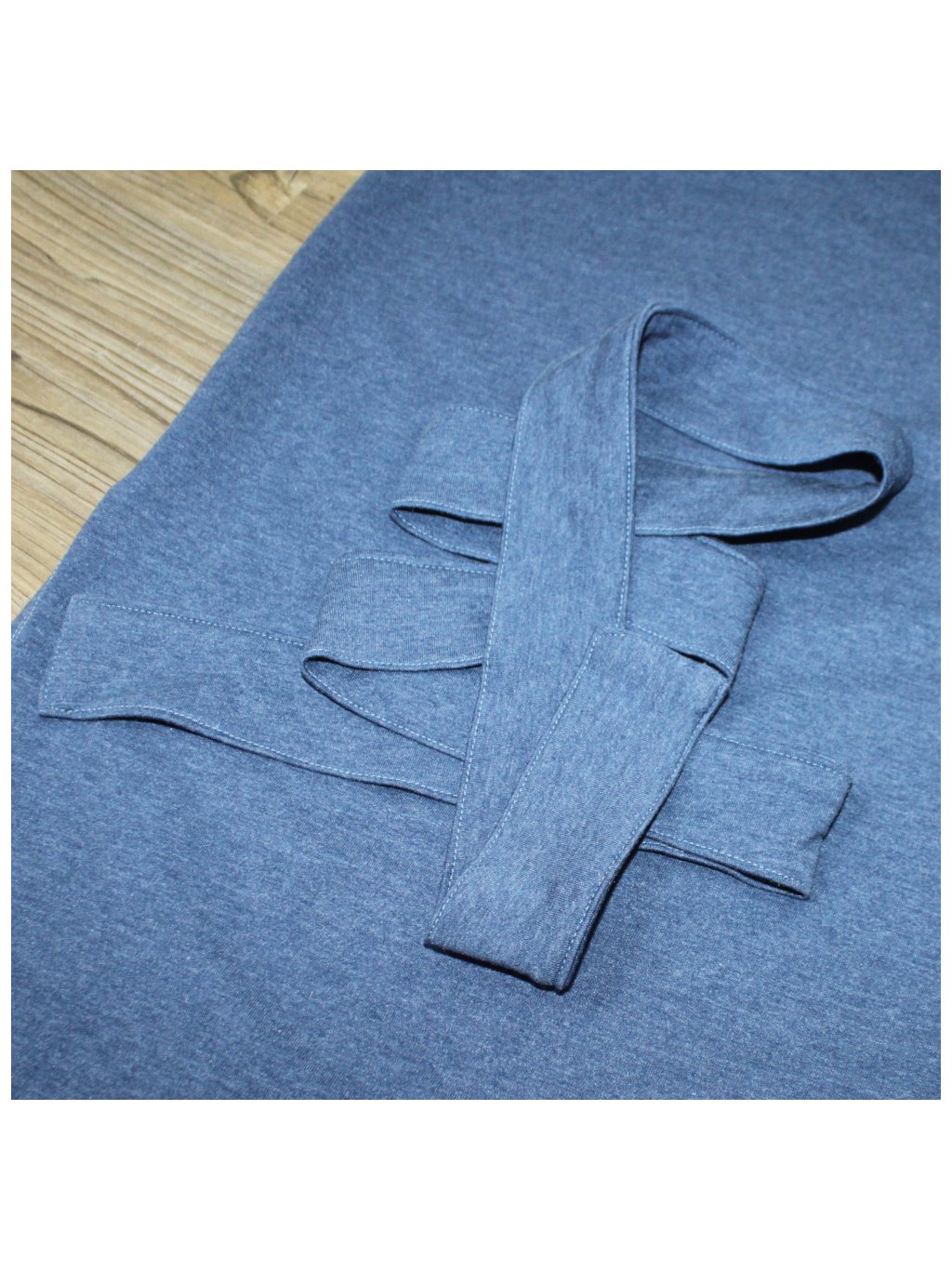 Šaty mají dlouhé rukávy. Průkrčník cca 5 cm hluboký, kulatý s obrubou a prošitím. Šaty se snadno přizpůsobí postavě. Přes břicho a zadek jsou šaty volnějšího střihu. V dolním kraji jsou rozparky pro snadnější chůzi. K šatům je i pásek ze stejného materiálu. Pásek lze uvázat v pase, pod prsy nebo pod pasem. |