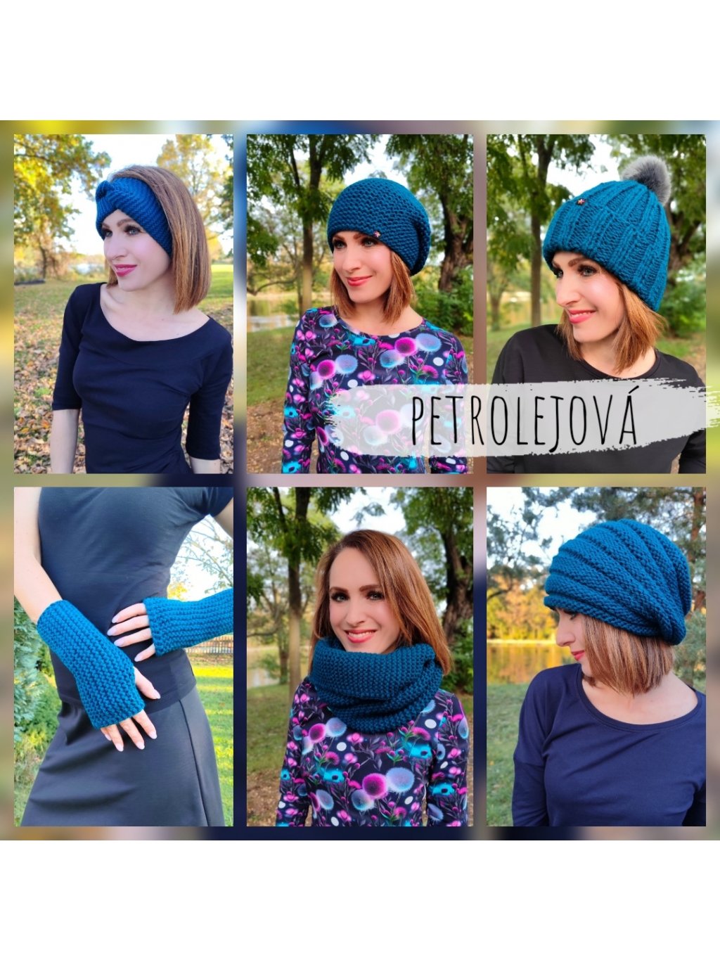 K návlekům na ruce máme ze stejné vlny pletené i zimní čepice a zimní čelenky.