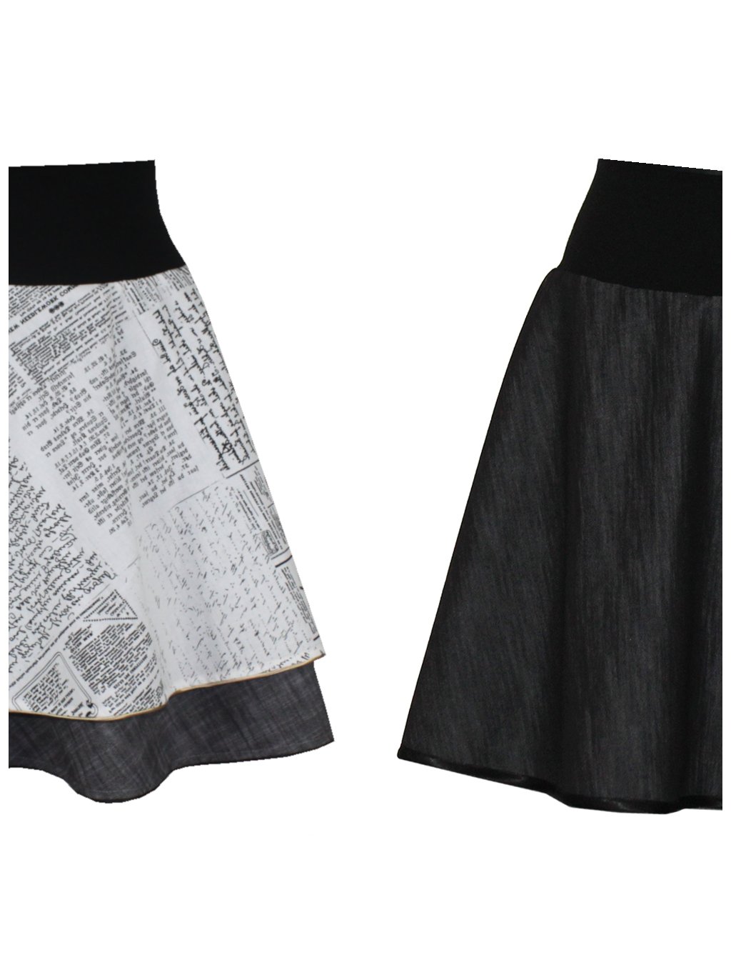 Oboustranná dámská sukně je vhodná od podzimu do jara, sukně je půlkolová. Z jedné strany je džínová sukně, z druhé strany je bavlněná sukně s potiskem novin. Sukně se dá nosit z obou stran.