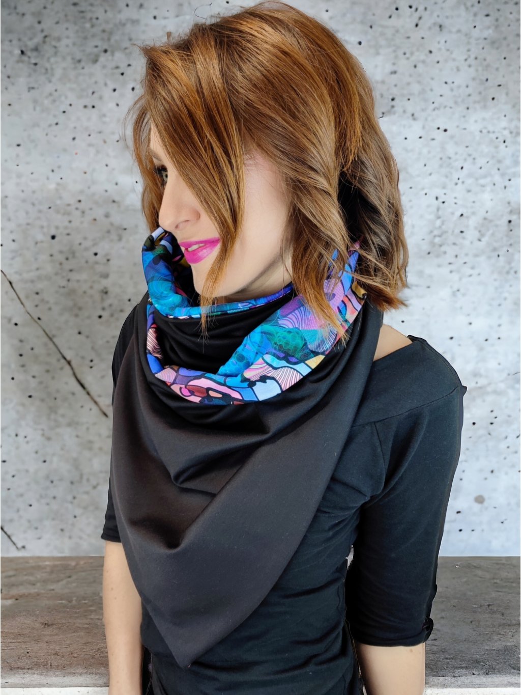 Oboustranná šála na knoflík, barevná mozaika/ černá