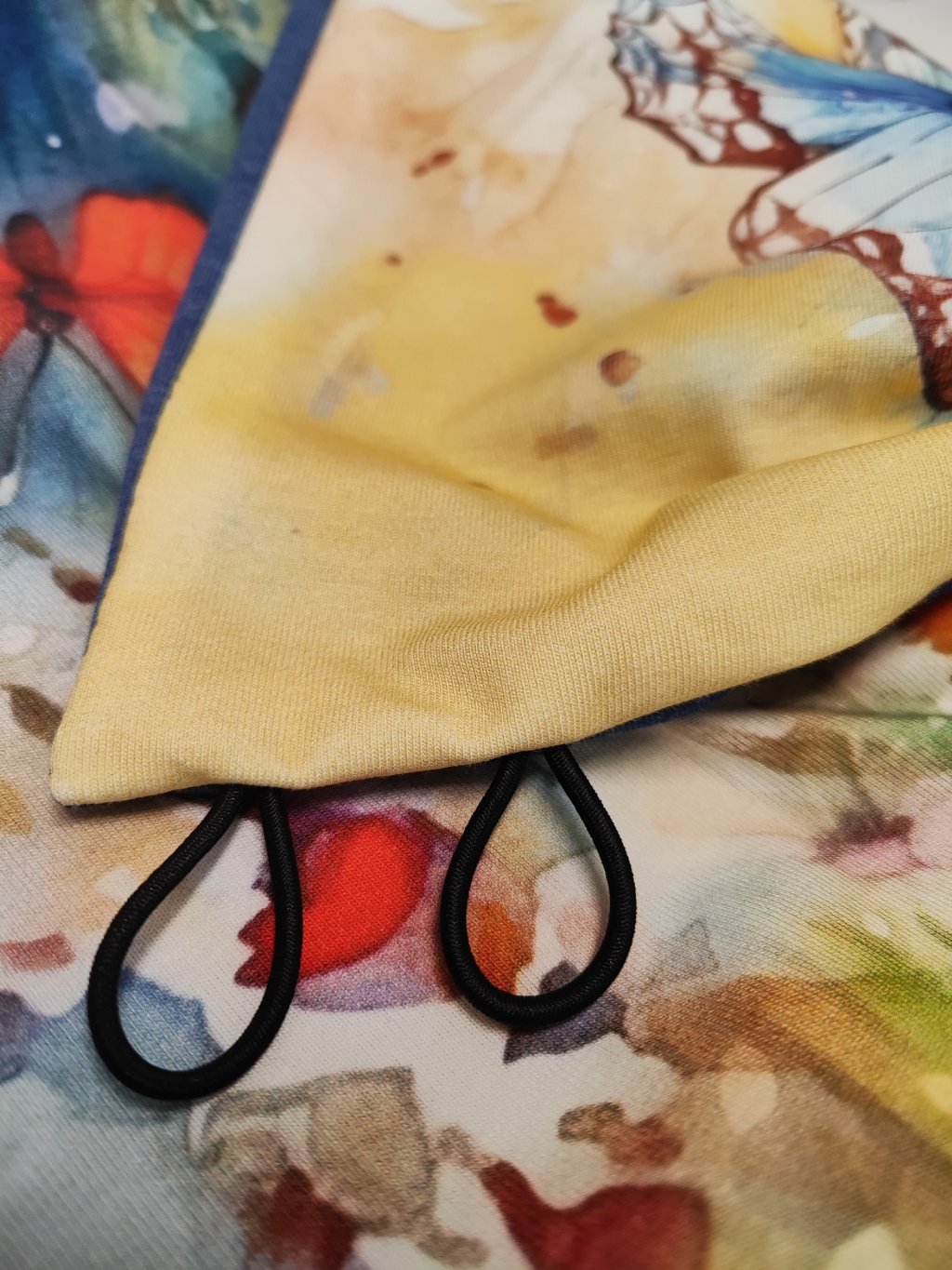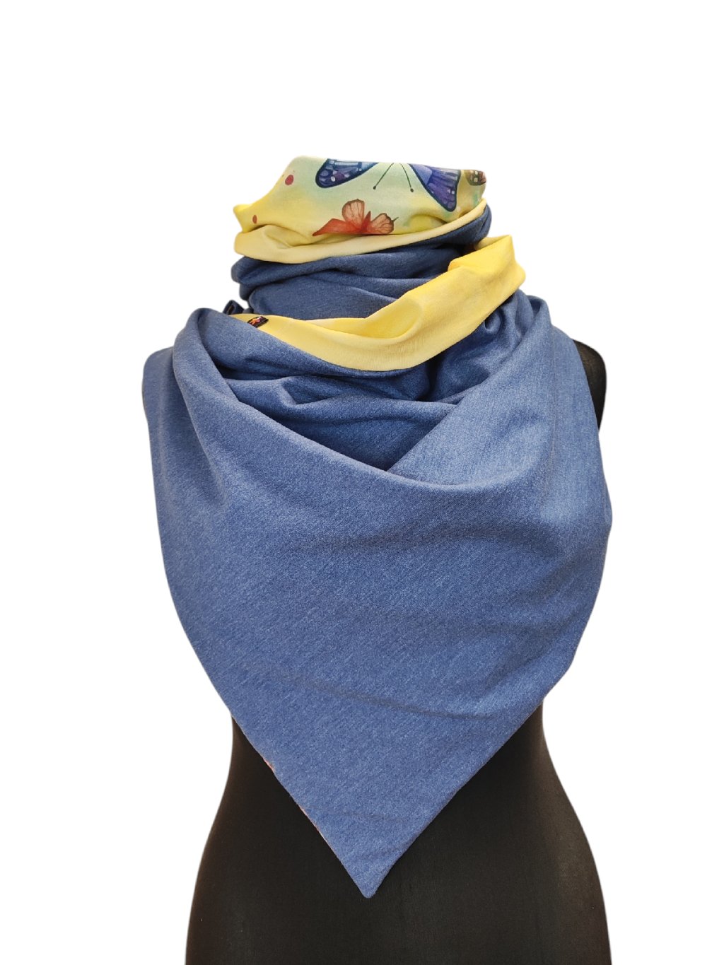 Oboustranná šála na knoflíky, žlutá s motýly/ šedo modrá