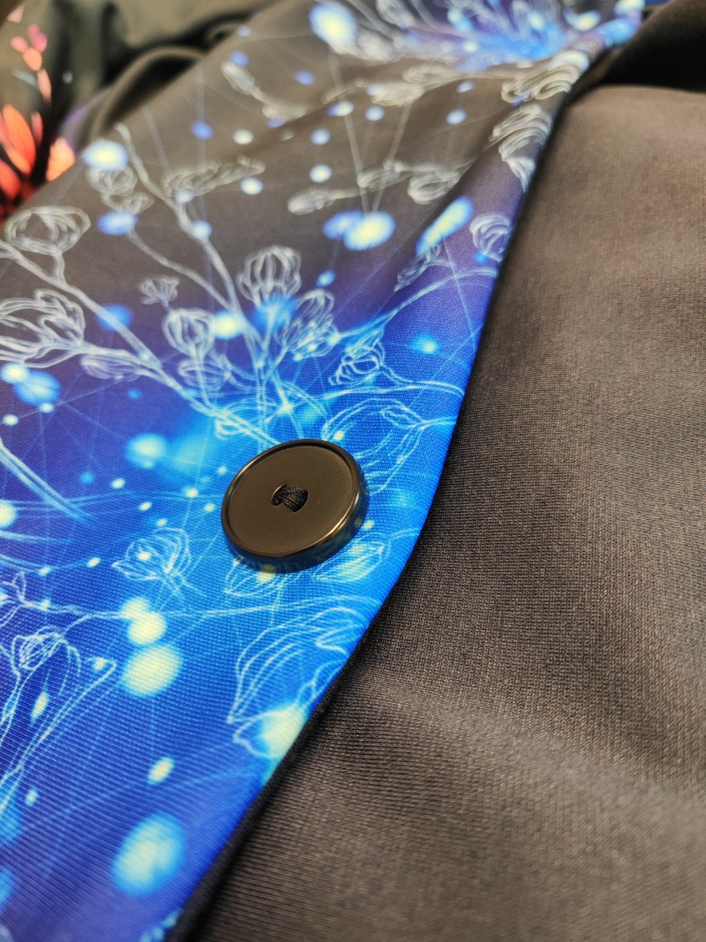 Šála je obdélníkového tvaru se zapínáním na jeden knoflík a je oboustranná – můžete ji nosit z obou stran podle nálady či outfitu.