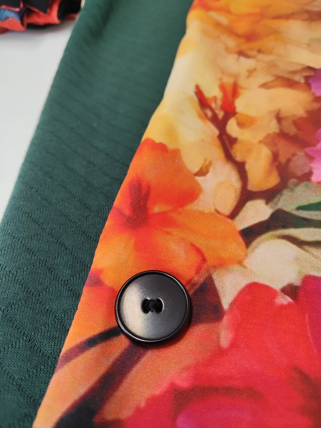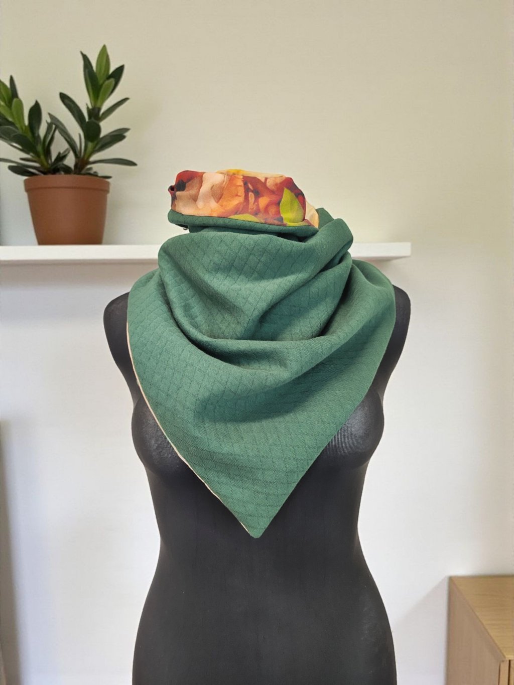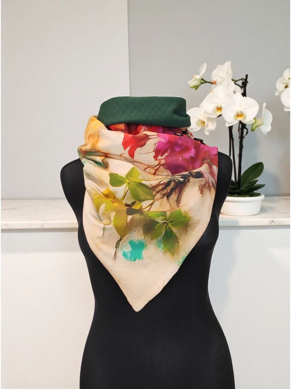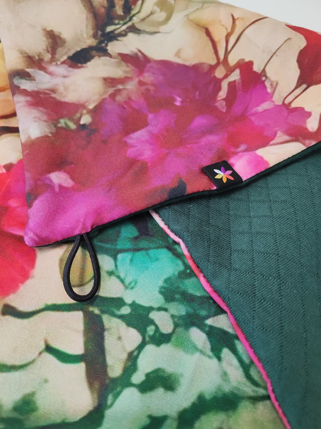 Oboustranná šátkošála na knoflík/ krátká šála na knoflík, akvarelové květy/ prošívaná zelená