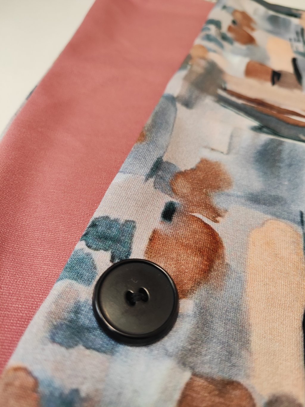 Šála je obdélníkového tvaru se zapínáním na jeden knoflík a je oboustranná – můžete ji nosit z obou stran podle nálady či outfitu.
