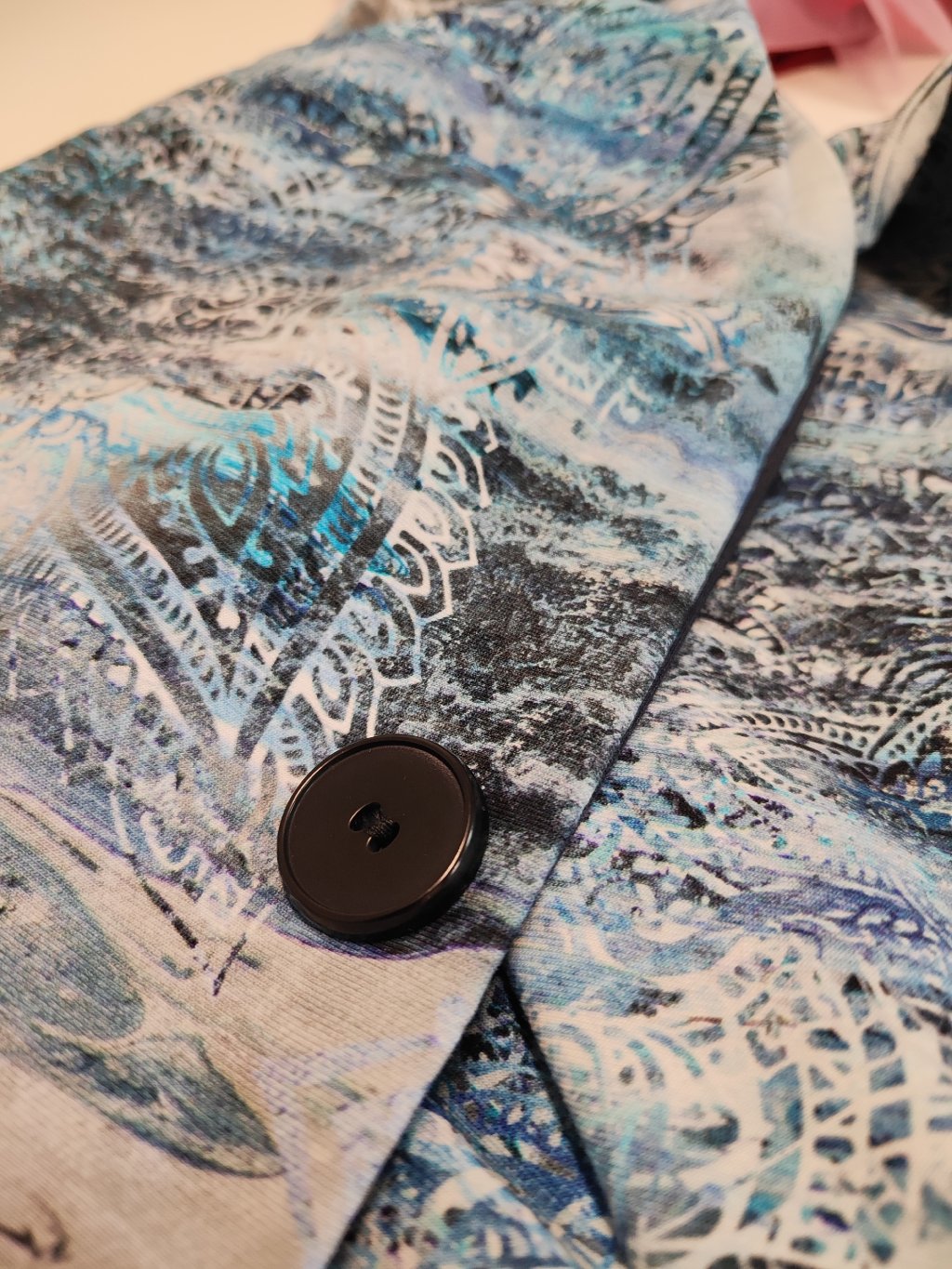 Šála je obdélníkového tvaru se zapínáním na jeden knoflík a je oboustranná – můžete ji nosit z obou stran podle nálady či outfitu.