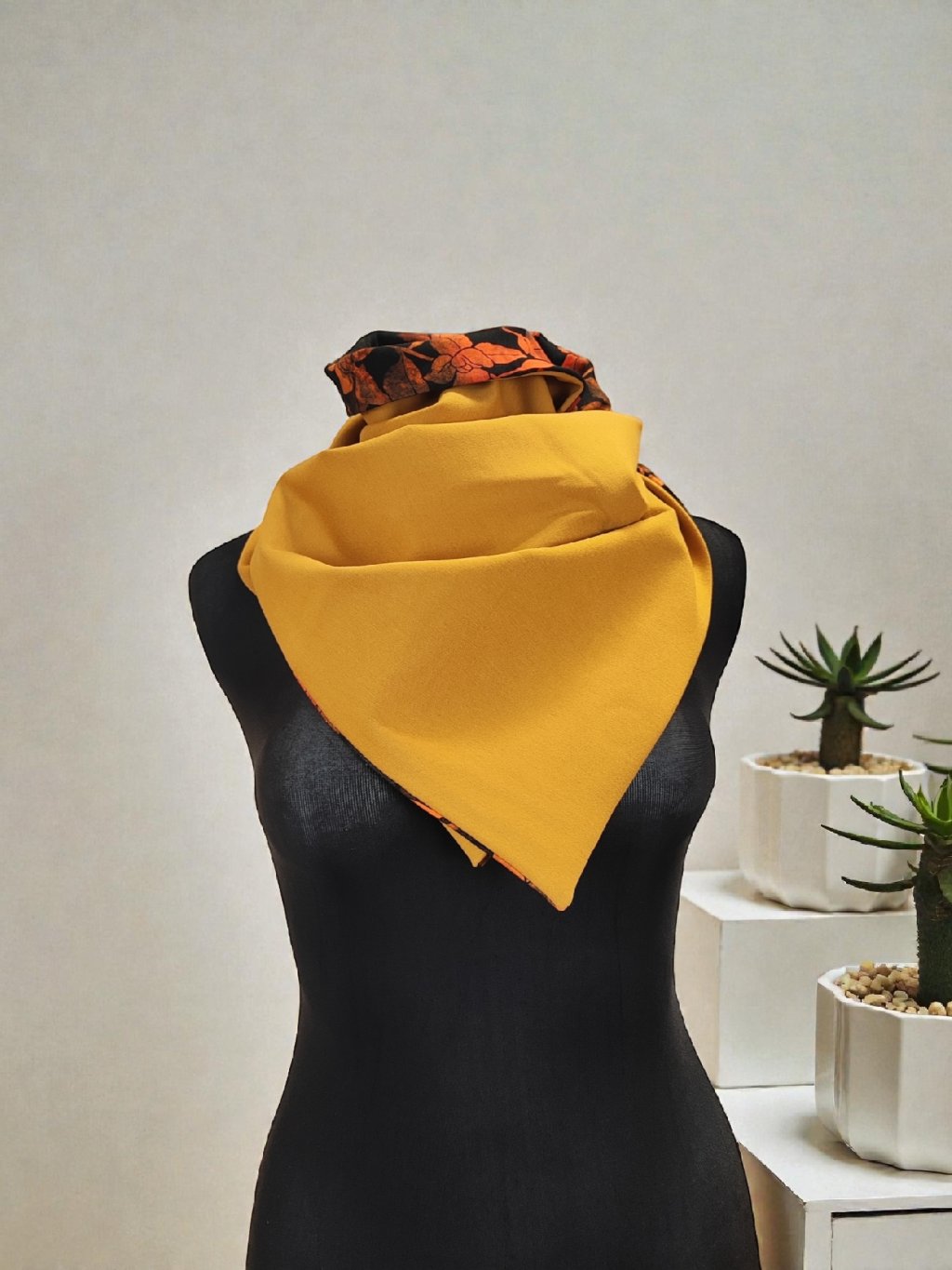 Šála je obdélníkového tvaru se zapínáním na jeden knoflík a je oboustranná – můžete ji nosit z obou stran podle nálady či outfitu.