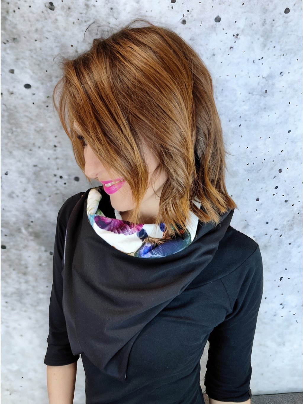 Okolo krku se omotává 1x. Jedná se o tzv. šátkošálu.