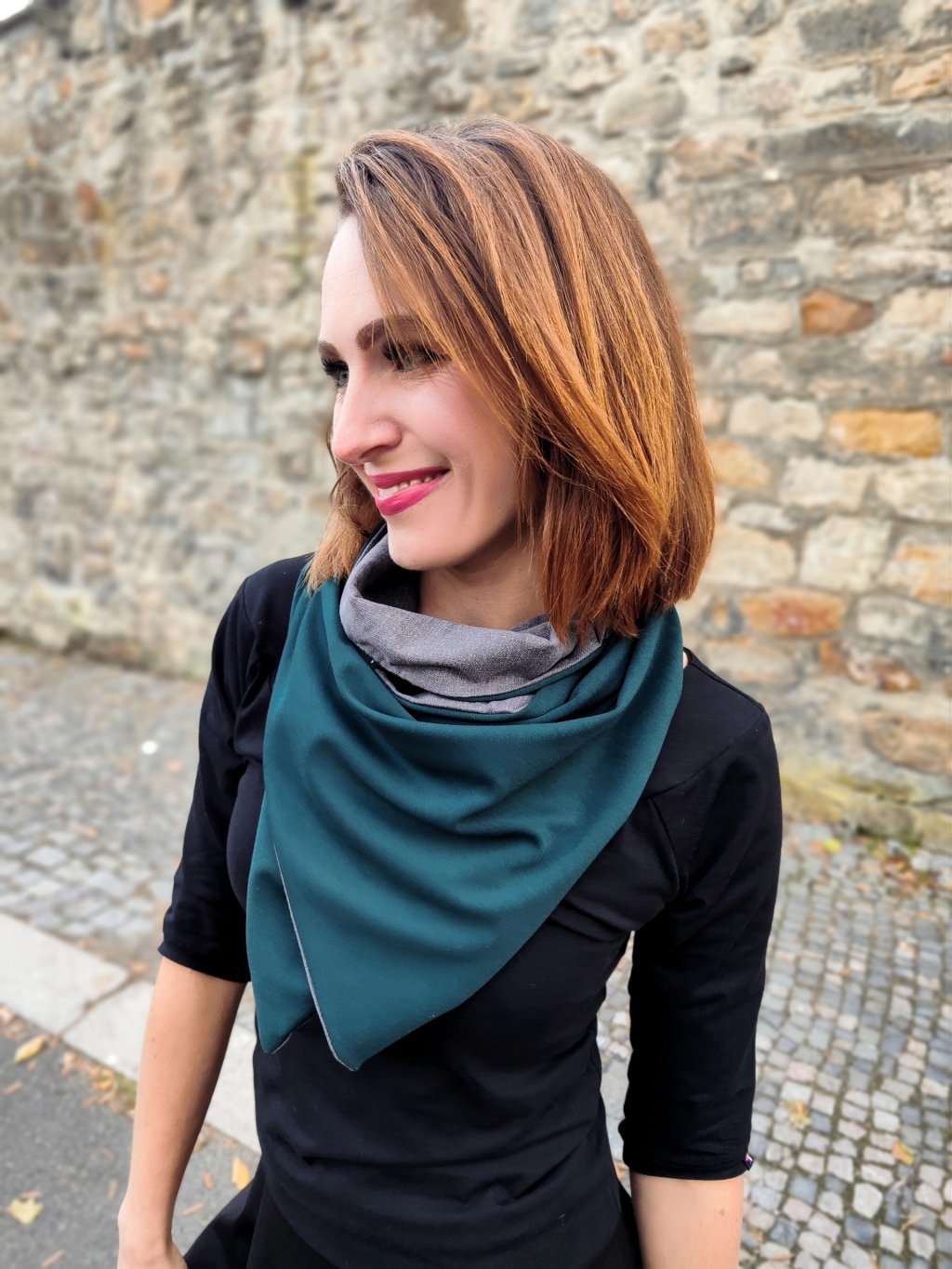 Oboustranná šála na knoflík se hodí od podzimu do jara.