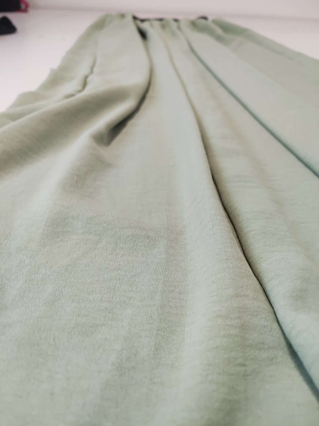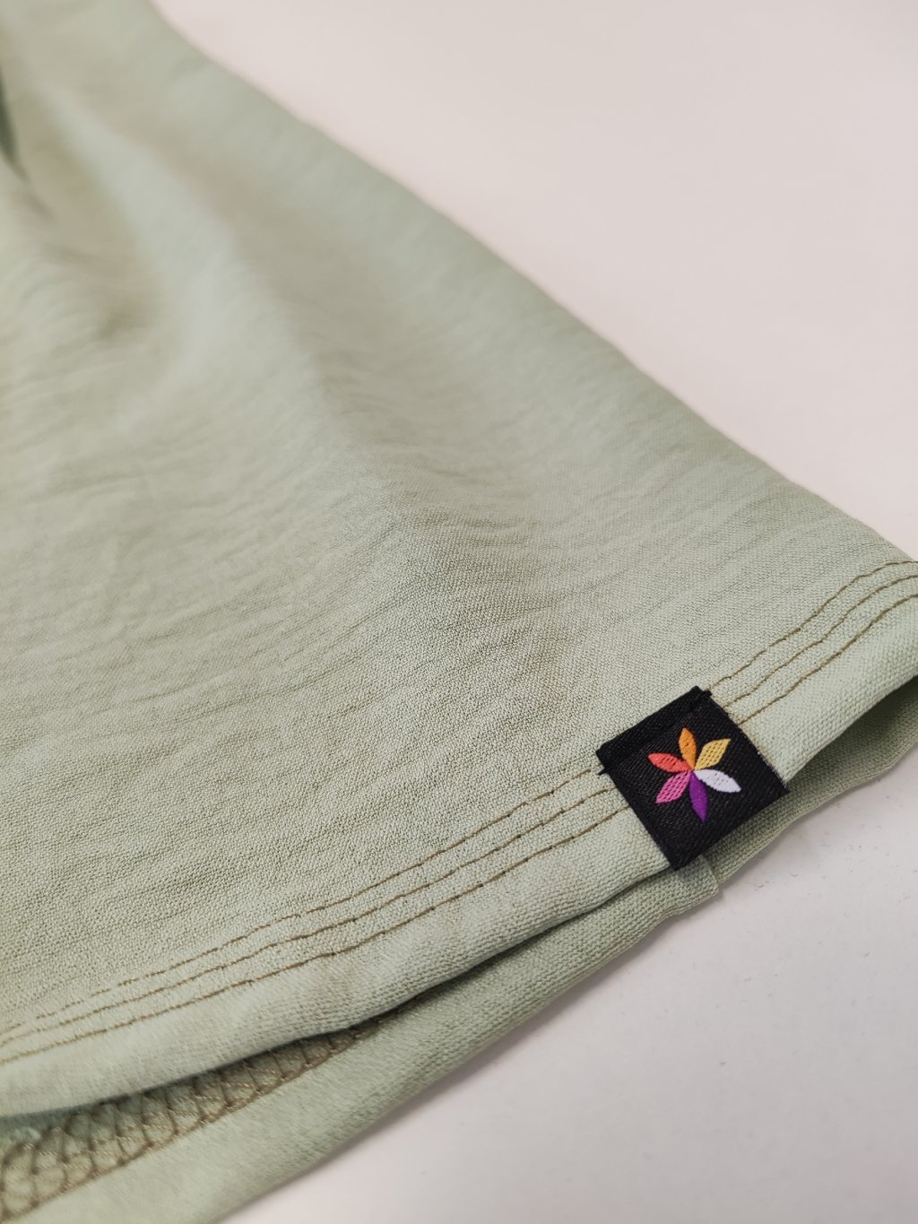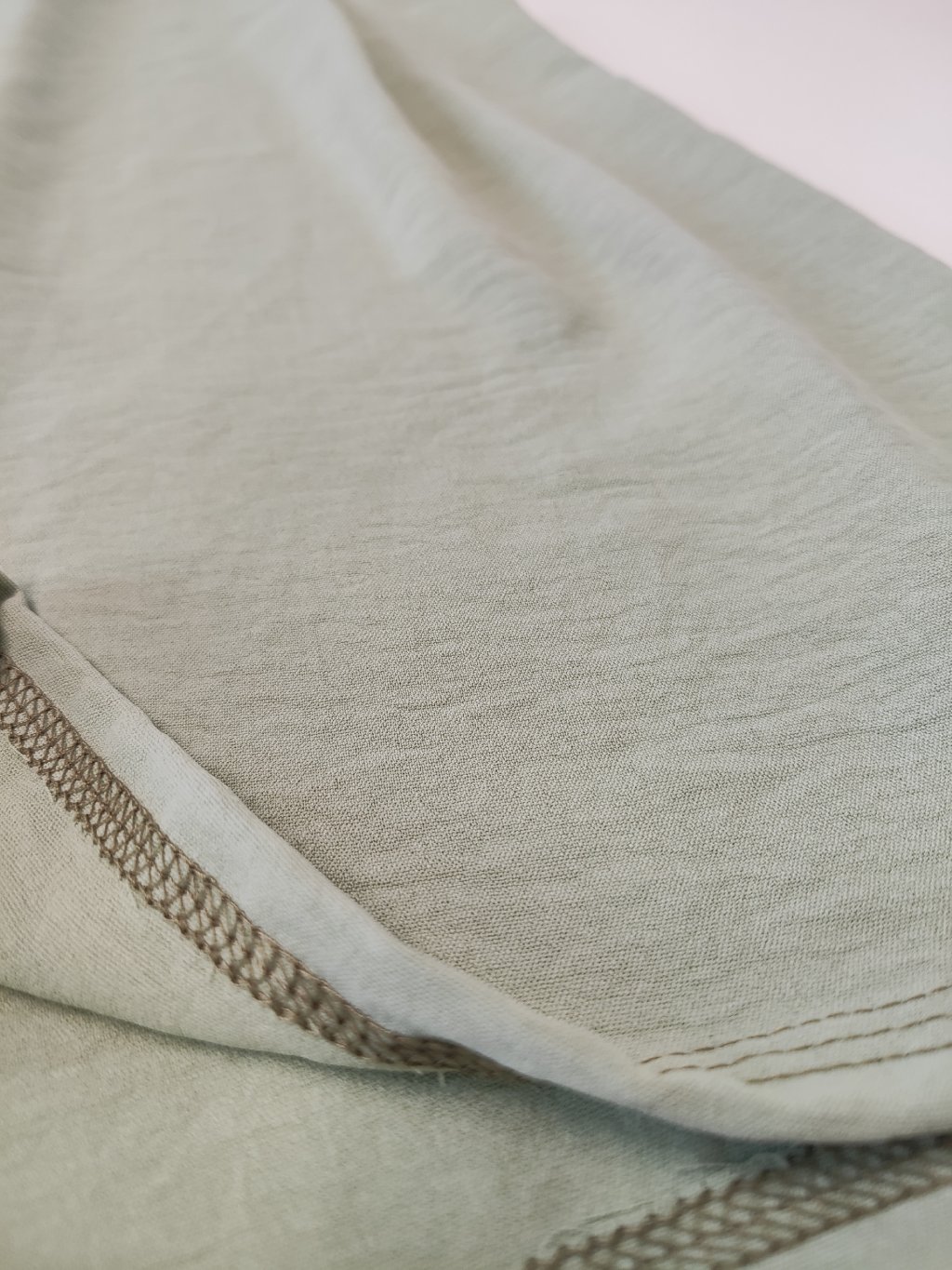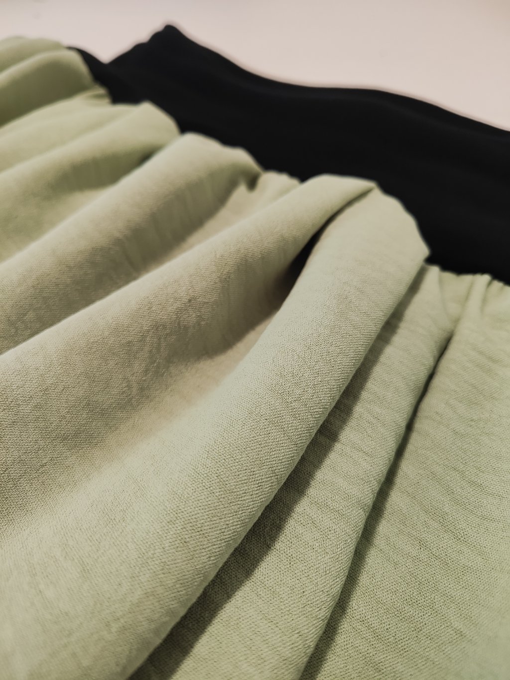 Sukně je z mačkaného polyesteru, který se nespírá, nemačká a rychle schne. Ideální pro cestování, rušné dny i horké léto. Praní doporučujeme na 30 °C, ideálně naruby a bez sušičky. Není třeba žehlit – textura látky je součástí designu.