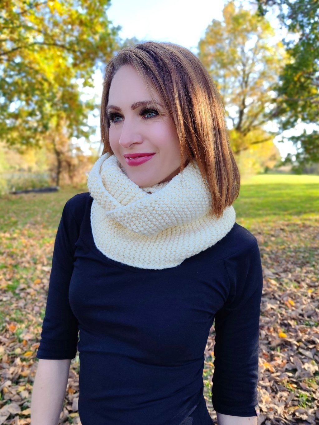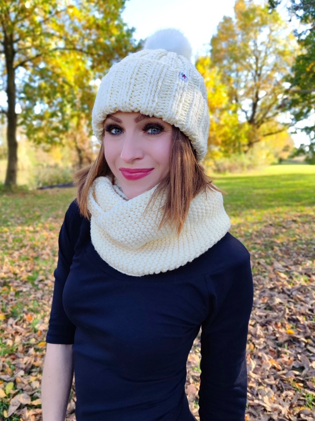 K nákrčníku se skvěle hodí pletená čelenka, čepice nebo návleky na ruce ze stejné vlny.