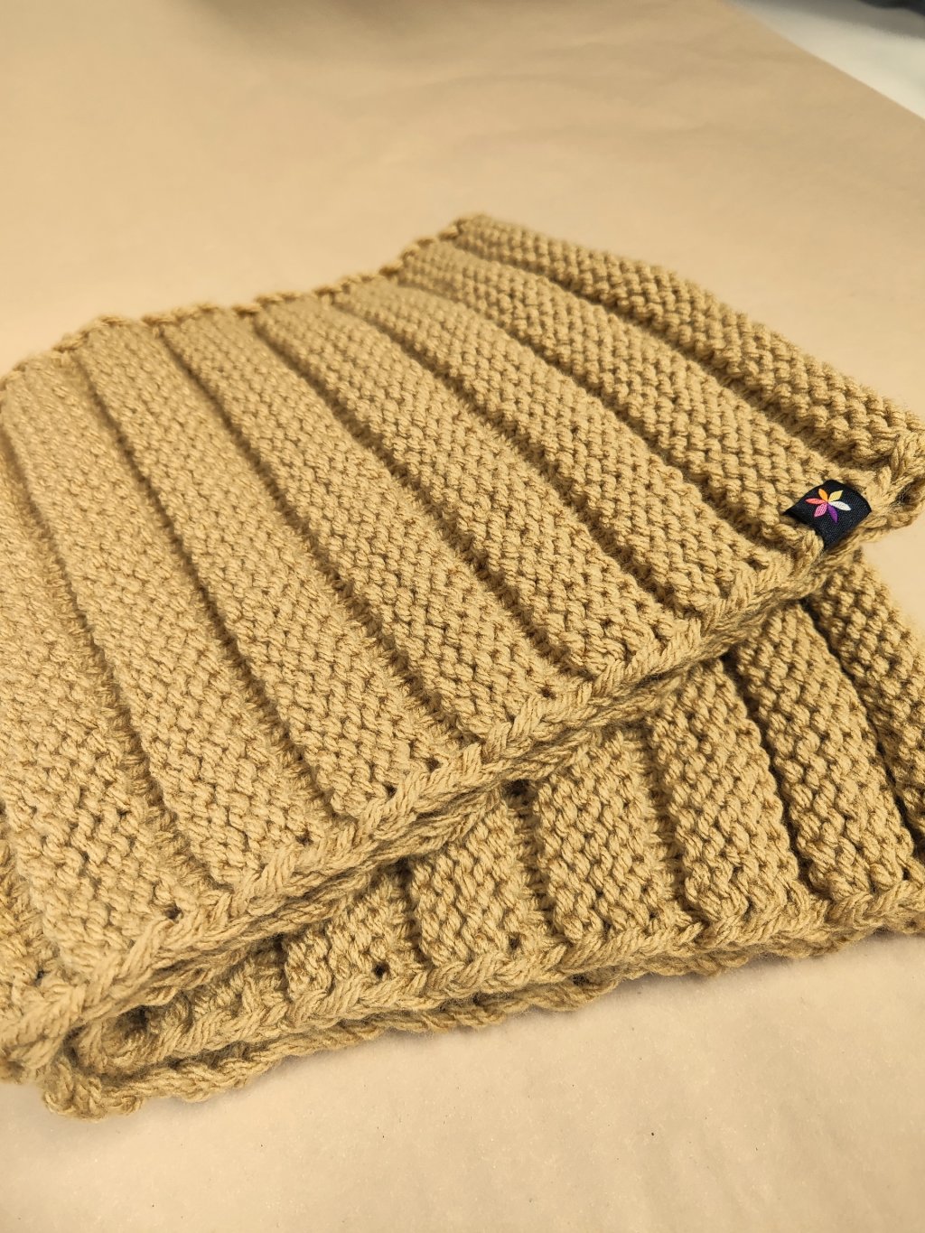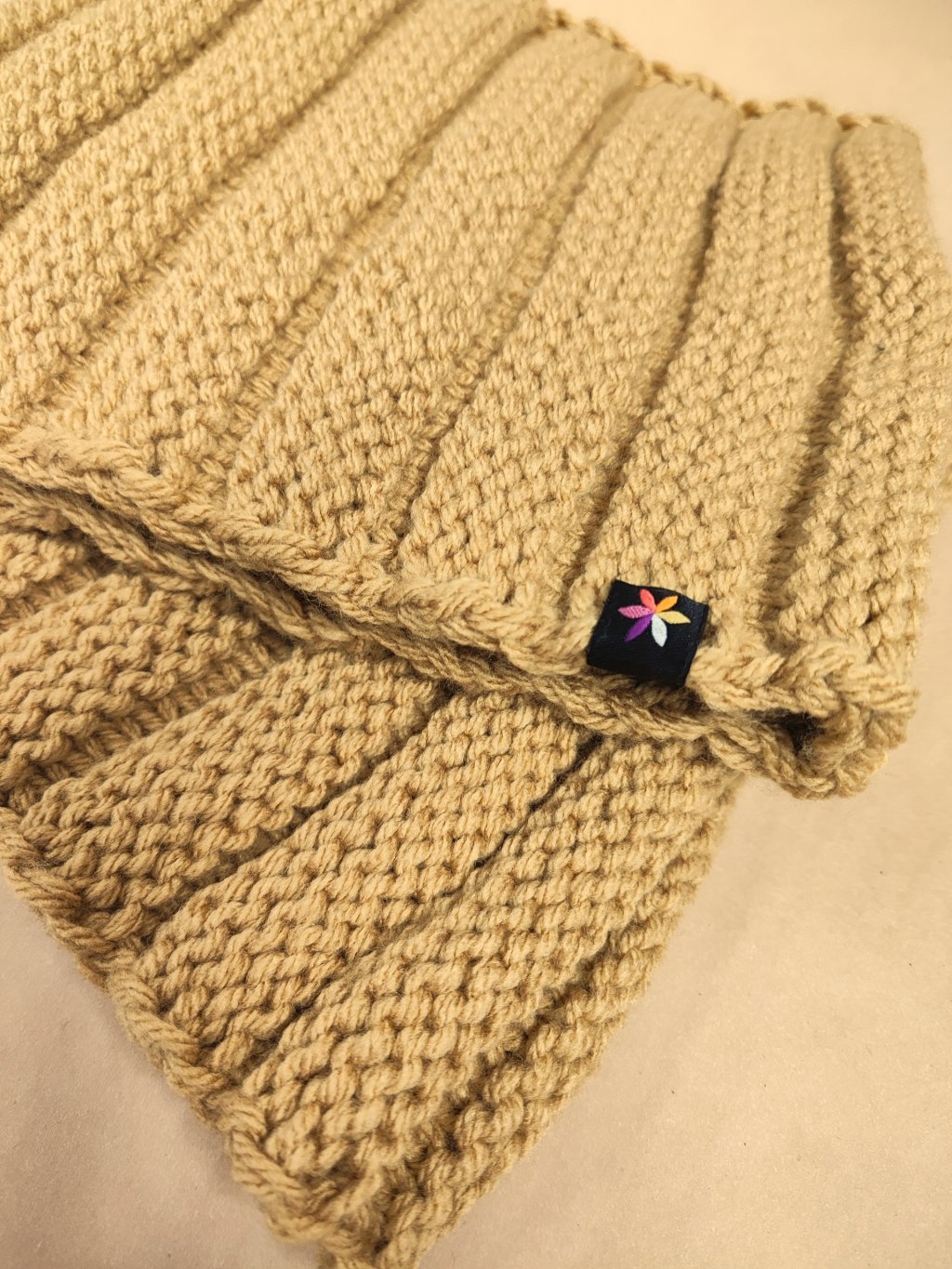 Tento nákrčník má jednoduchý kulatý střih, který se pohodlně protáhne přes hlavu a jednoduše omotá kolem krku. Pletenina je měkká a pružná, přizpůsobí se tvaru krku, a zároveň udrží hezký tvar. Dílně vytvářený kus bez strojové výroby dodává každému kousku originální charakter.