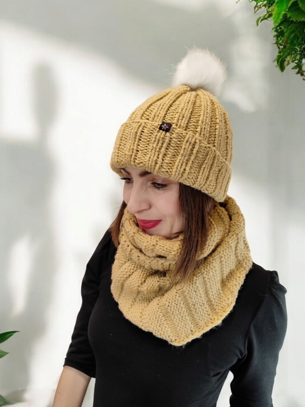 K nákrčníku se skvěle hodí pletená čelenka, čepice nebo návleky na ruce ze stejné vlny.