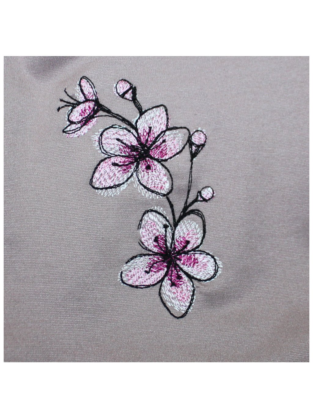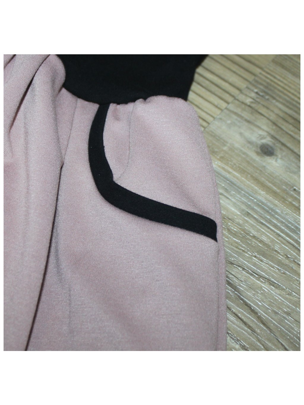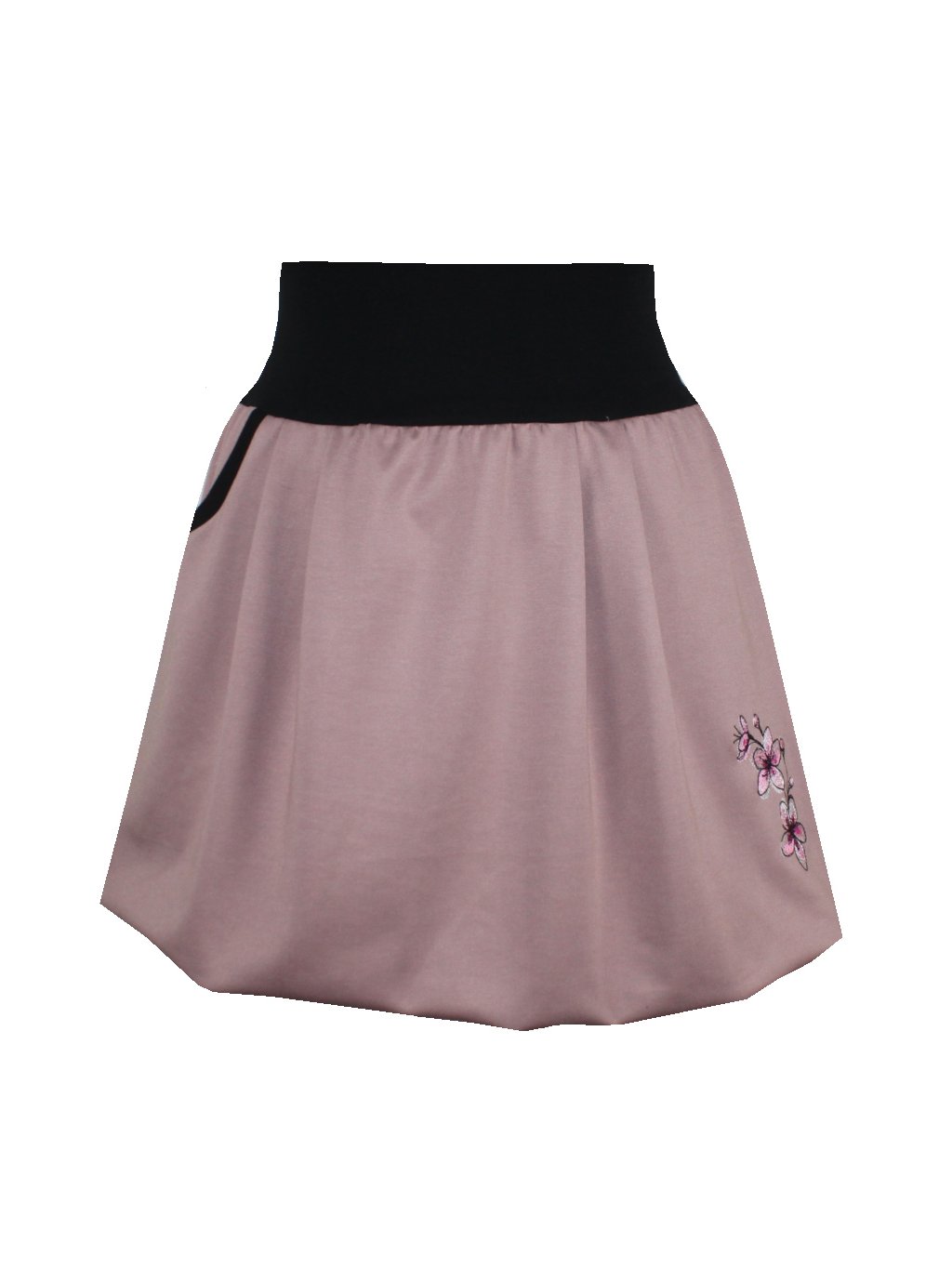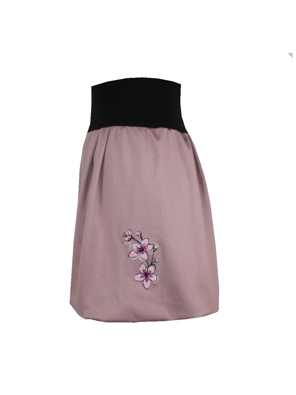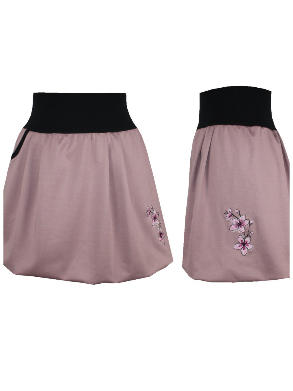 Pudrová sukně je balonového střihu. Na boku má výšivku.