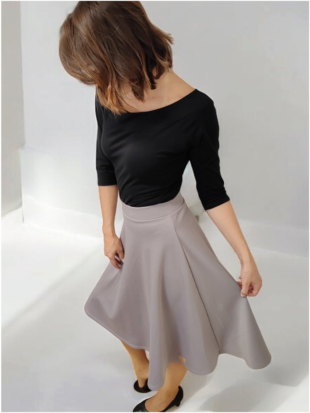 Půlkolová sukně ÁGATA do pasu je symbolem jemné elegance a volného pohybu. Střih s hladkou linií pasu zvýrazní ženské křivky, zatímco měkce splývavý úplet se krásně vlní při chůzi.