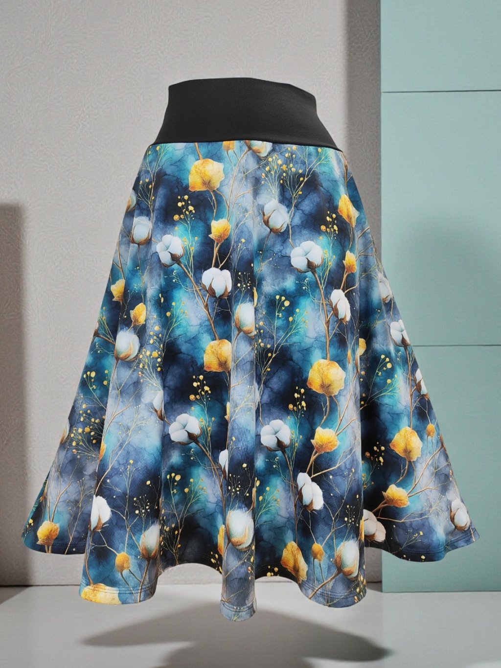 Půlkolový střih se rozevírá do měkkých linií, které se ladně hýbou s každým krokem. Sukně má příjemný úpletový pas bez tlačící gumy a délku, kterou si můžete zvolit podle sebe — od ke kolenům až po midi variantu. Tento střih je oblíbený pro svou lehkost, ženskost a schopnost slušet každé postavě.