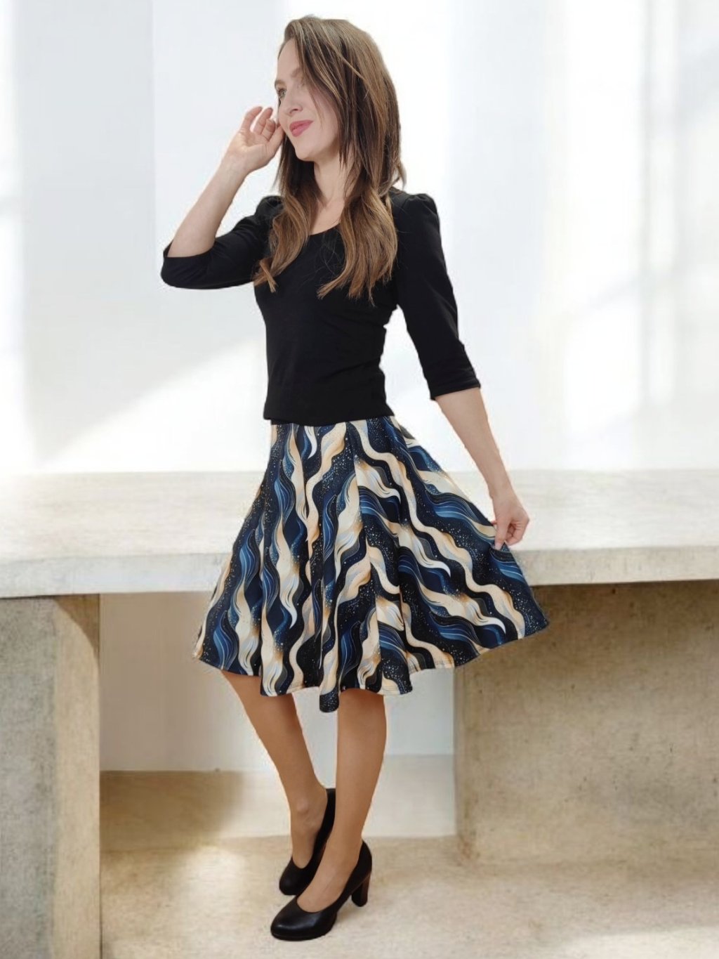 Tato sukně je určena pro ženy, které hledají kombinaci elegance a pohodlí. Vhodná pro chladné měsíce, do práce, na procházky nebo setkání s přáteli.