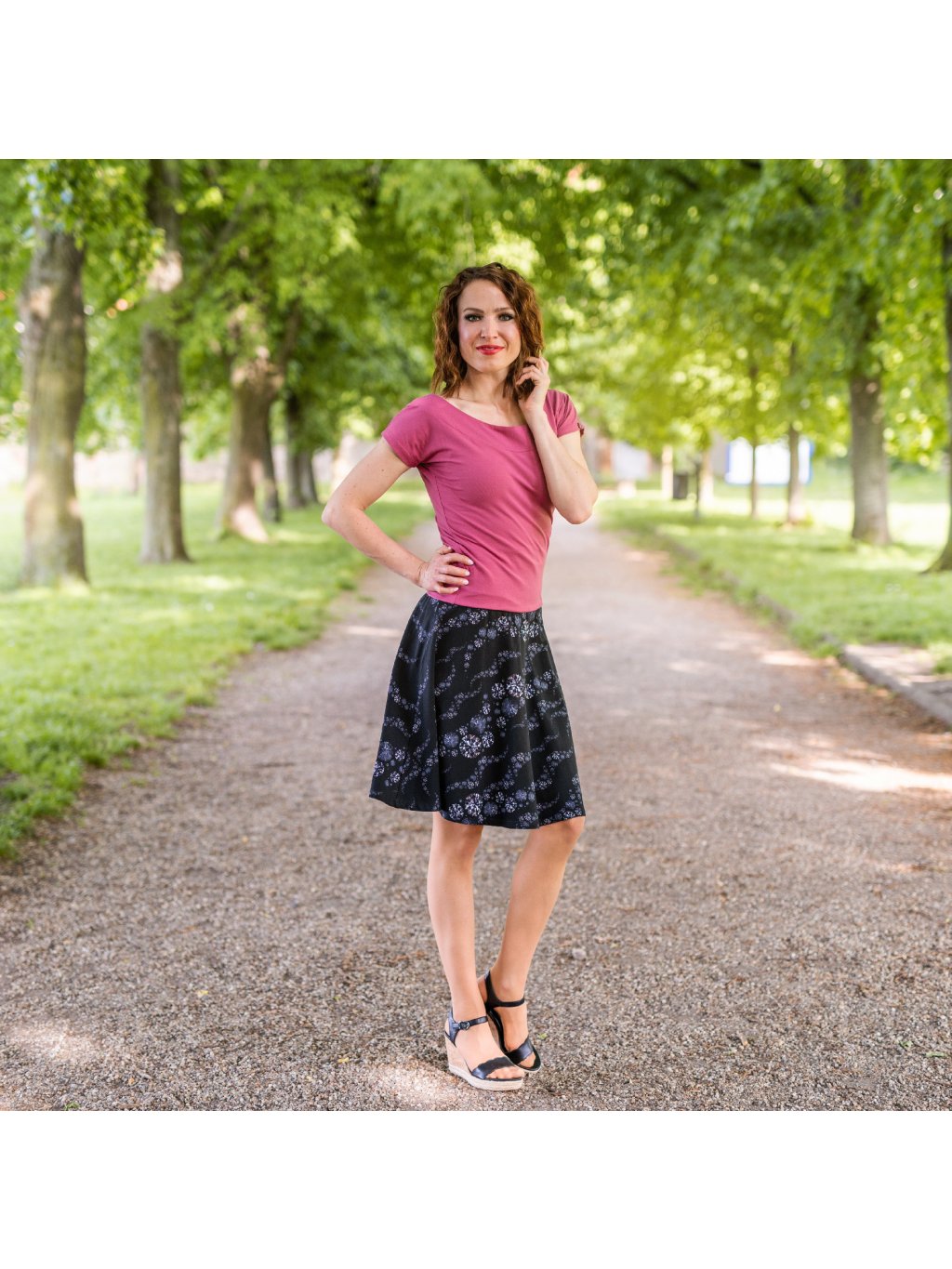 Tato sukně je půlkolového střihu, ke kolenům se rozšiřuje.