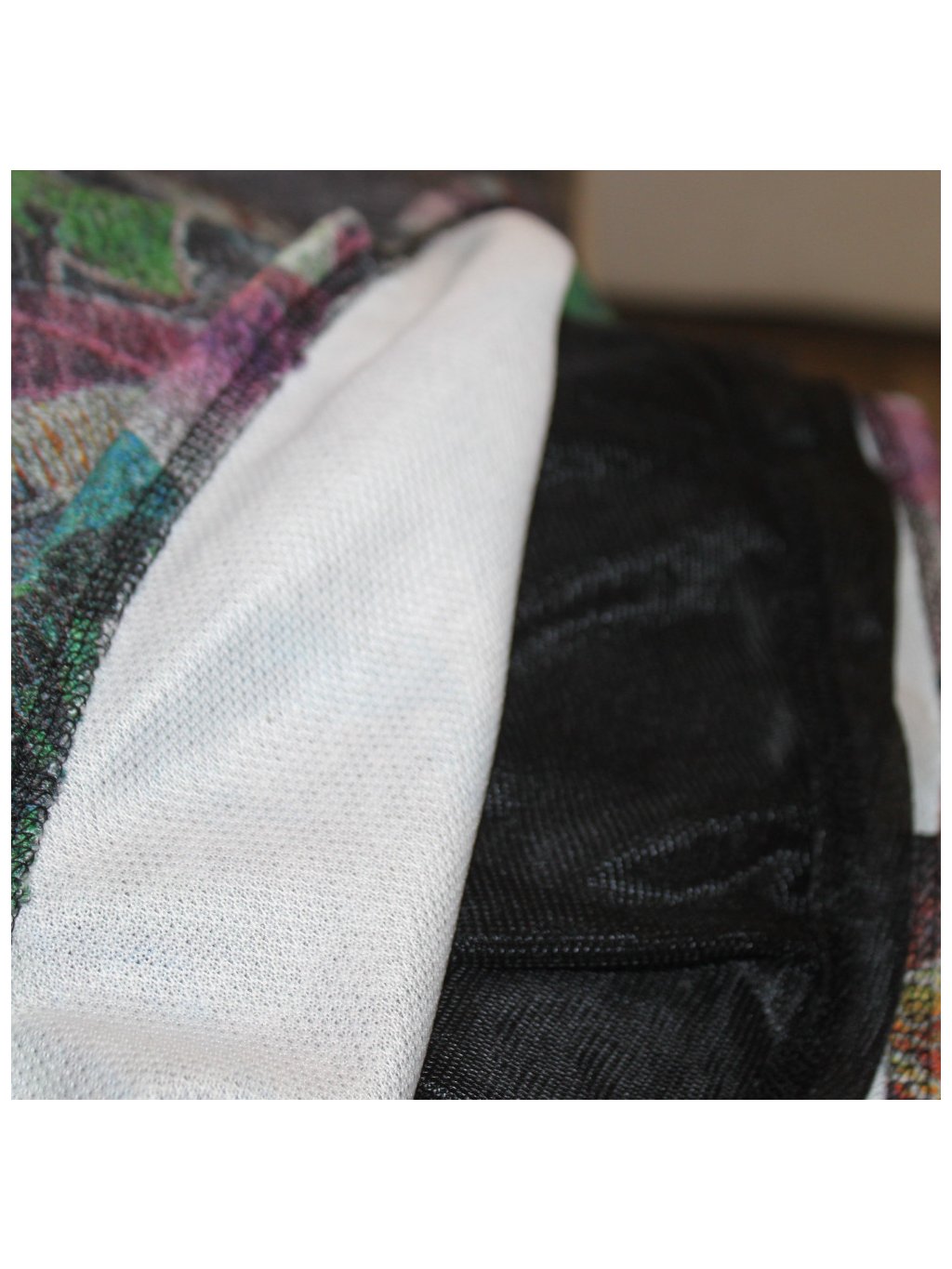 Úplet je vícebarevný, středně silný, splývavý. 75% polyester/ 20% viskoza / 5% elastan.