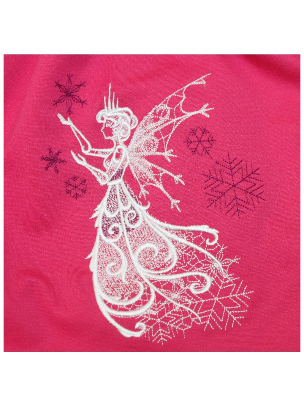 Na boku je výšivka víly.