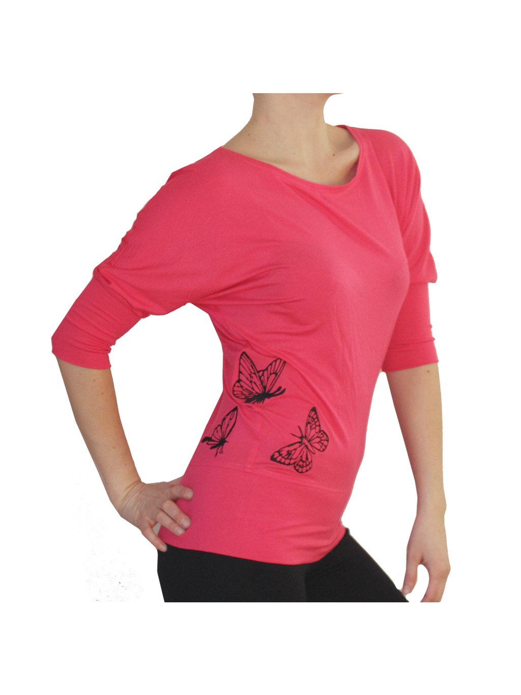 Dámské tričko v růžové barvě s vyšitým obrázkem na boku využijete celoročně. Výšivka motýlů.