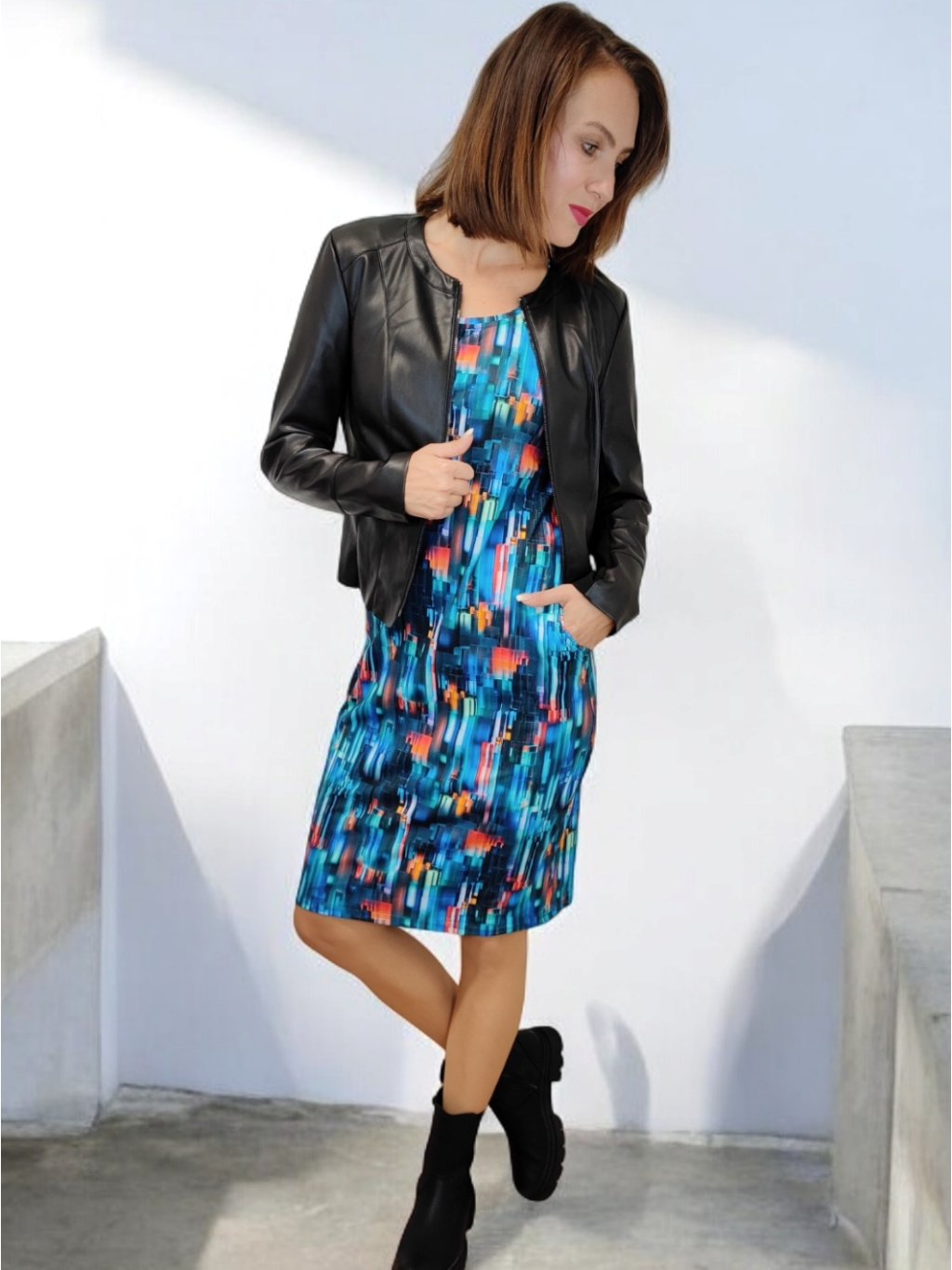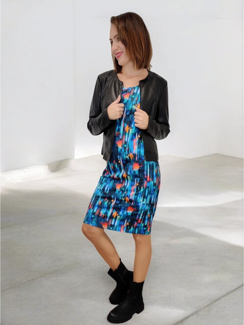 Vzorované dámské šaty ze středně silného úpletu s digitálním potiskem.