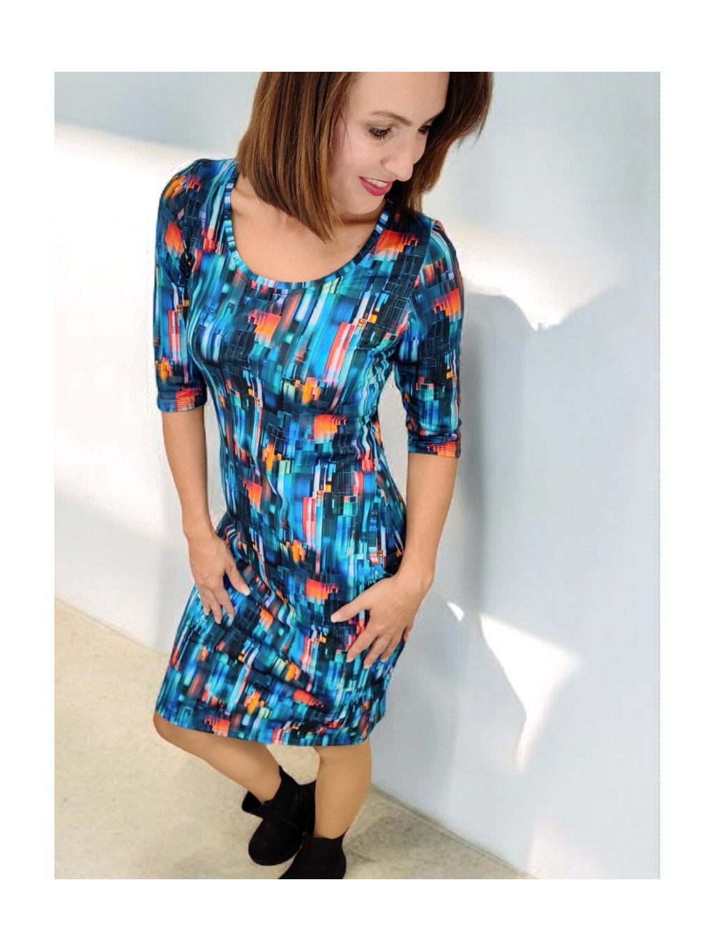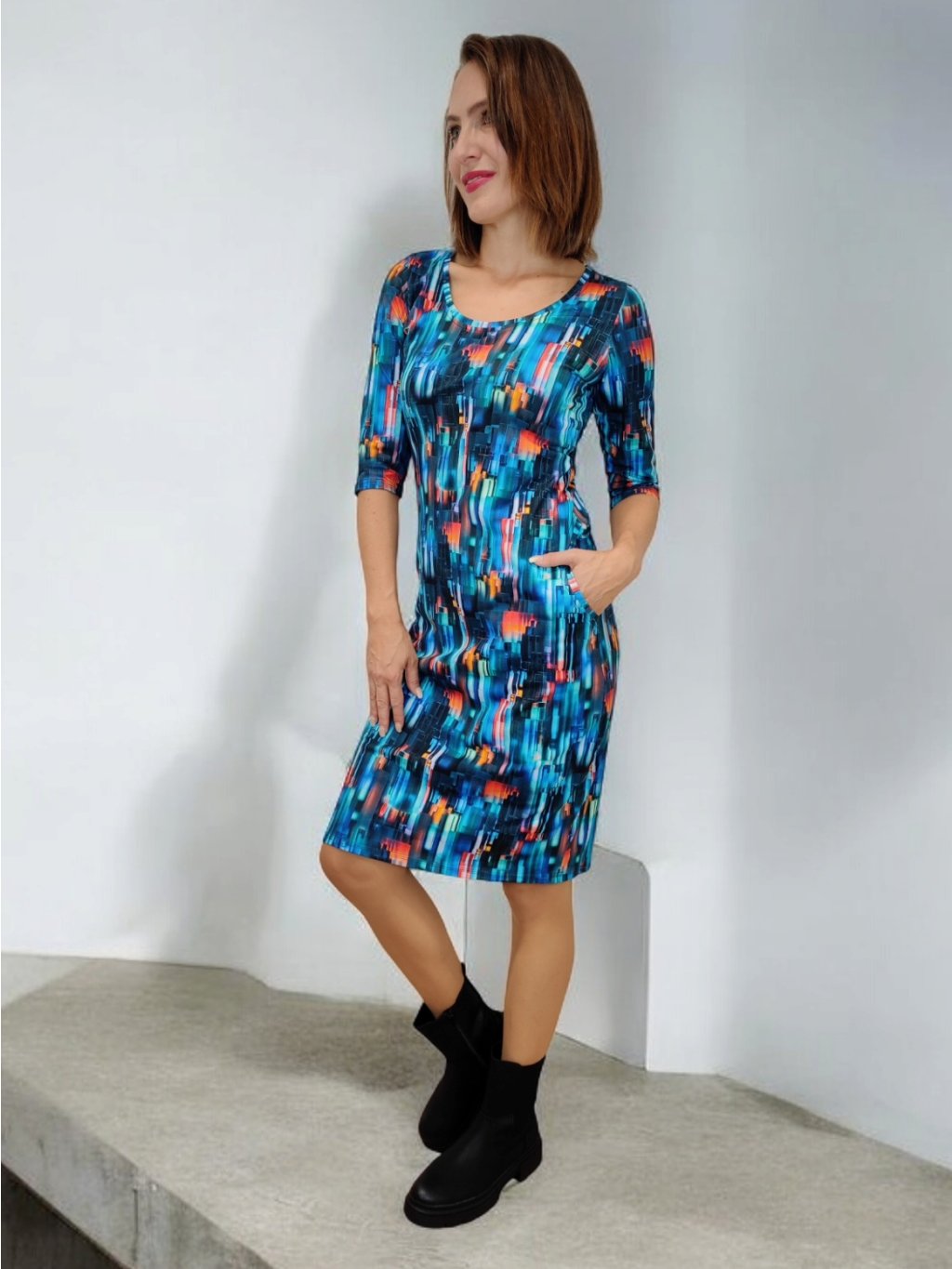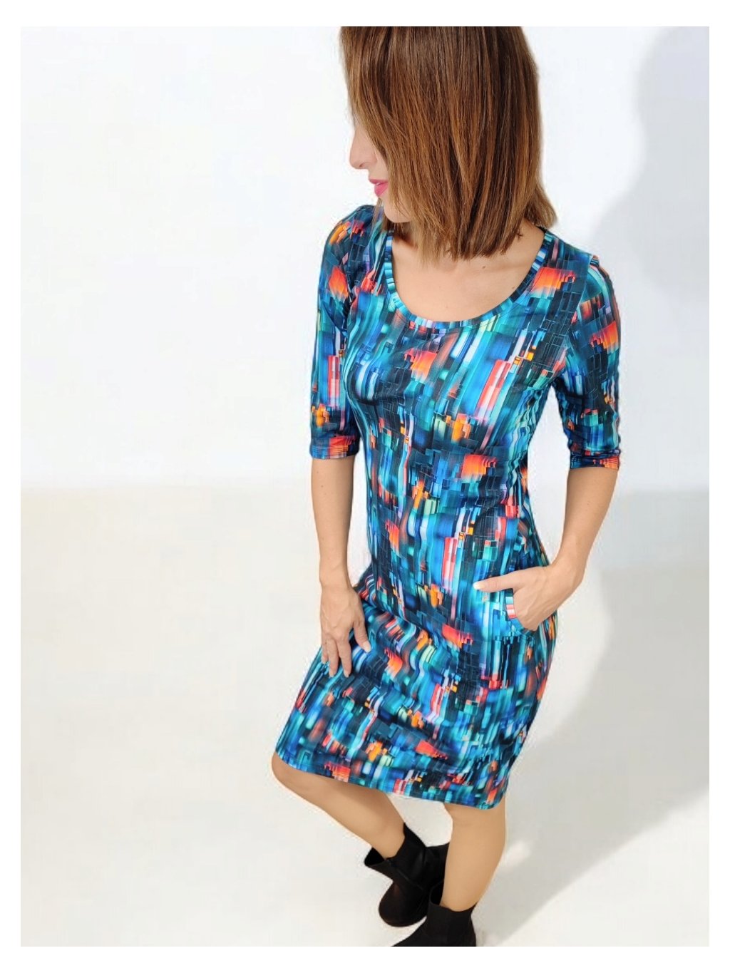 Šaty mají kulatý hlubší výstřih, 3/4 rukávy a kapsy v bocích. (Dlouhé rukávy si můžete zvolit).