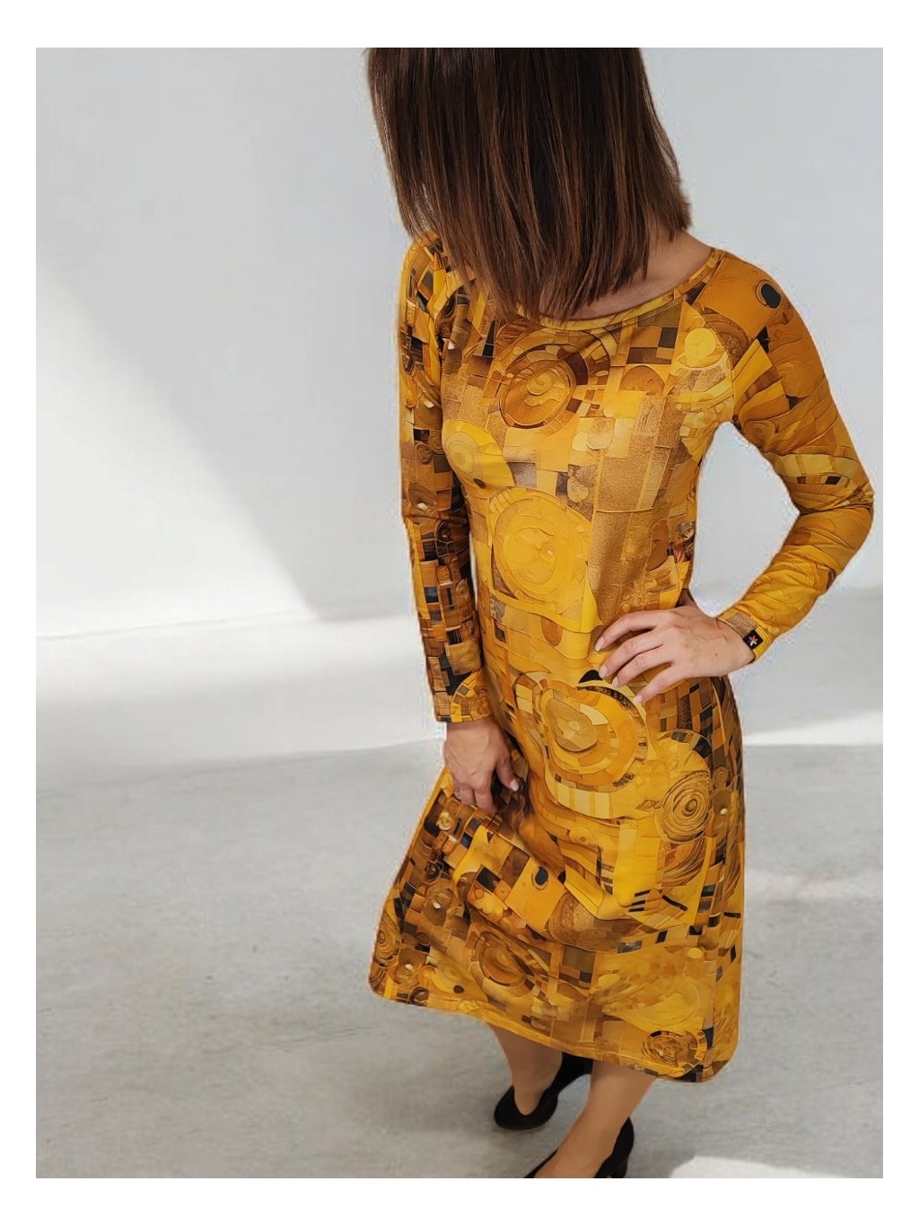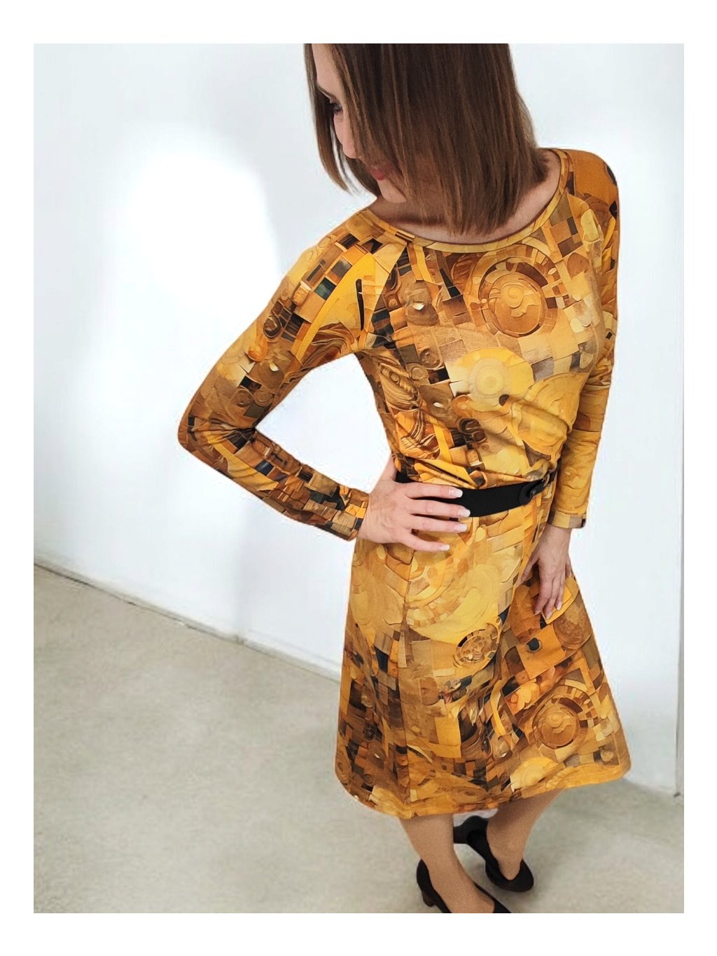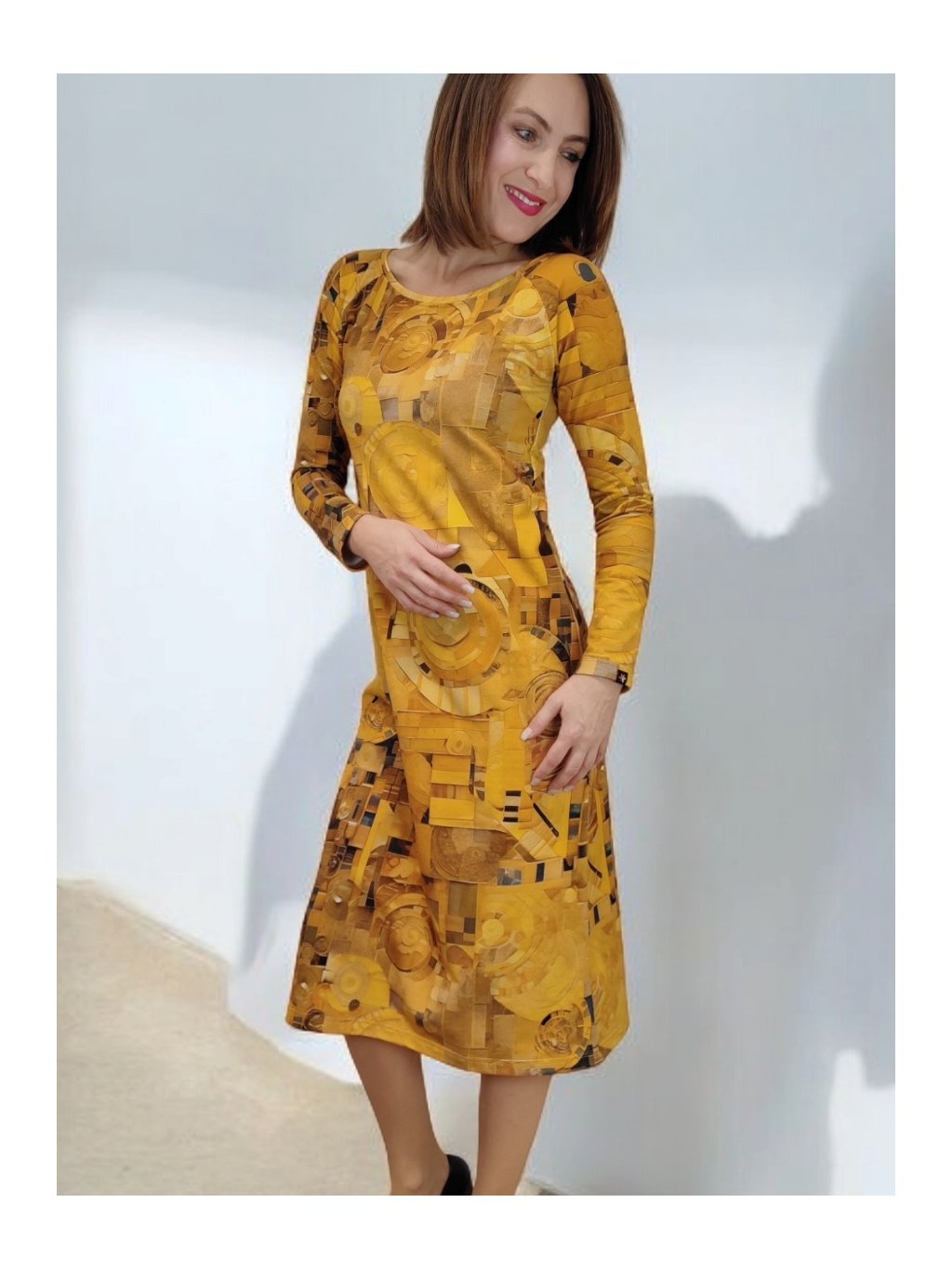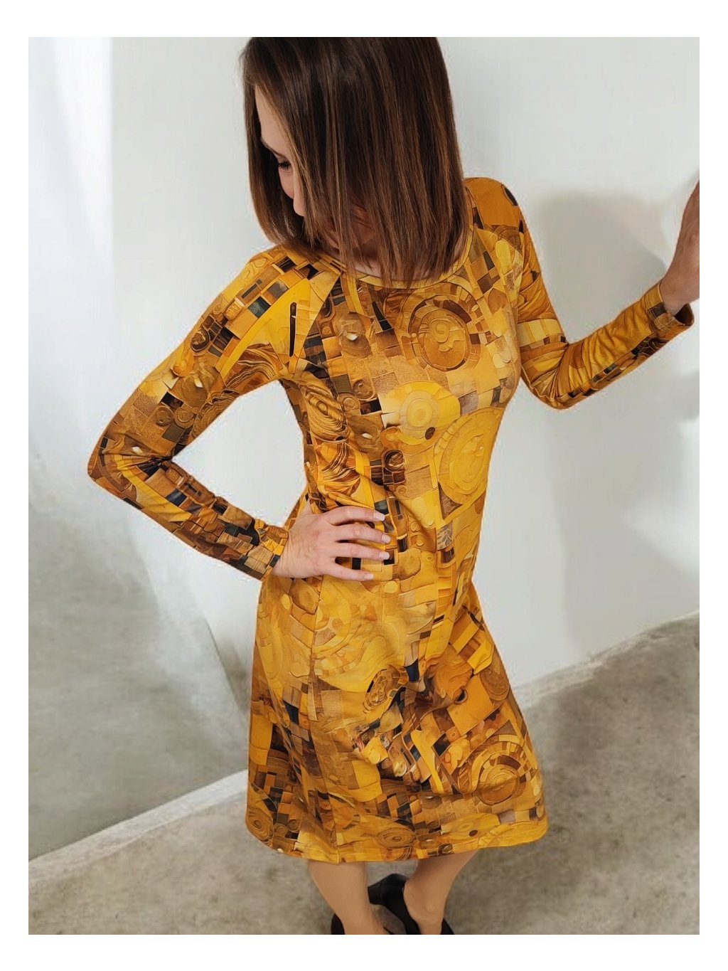 Šaty KELLY, okrová abstrakce, volba délky rukávů