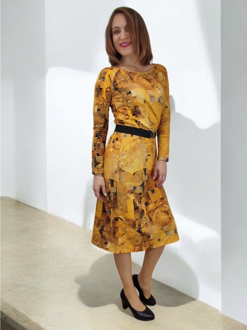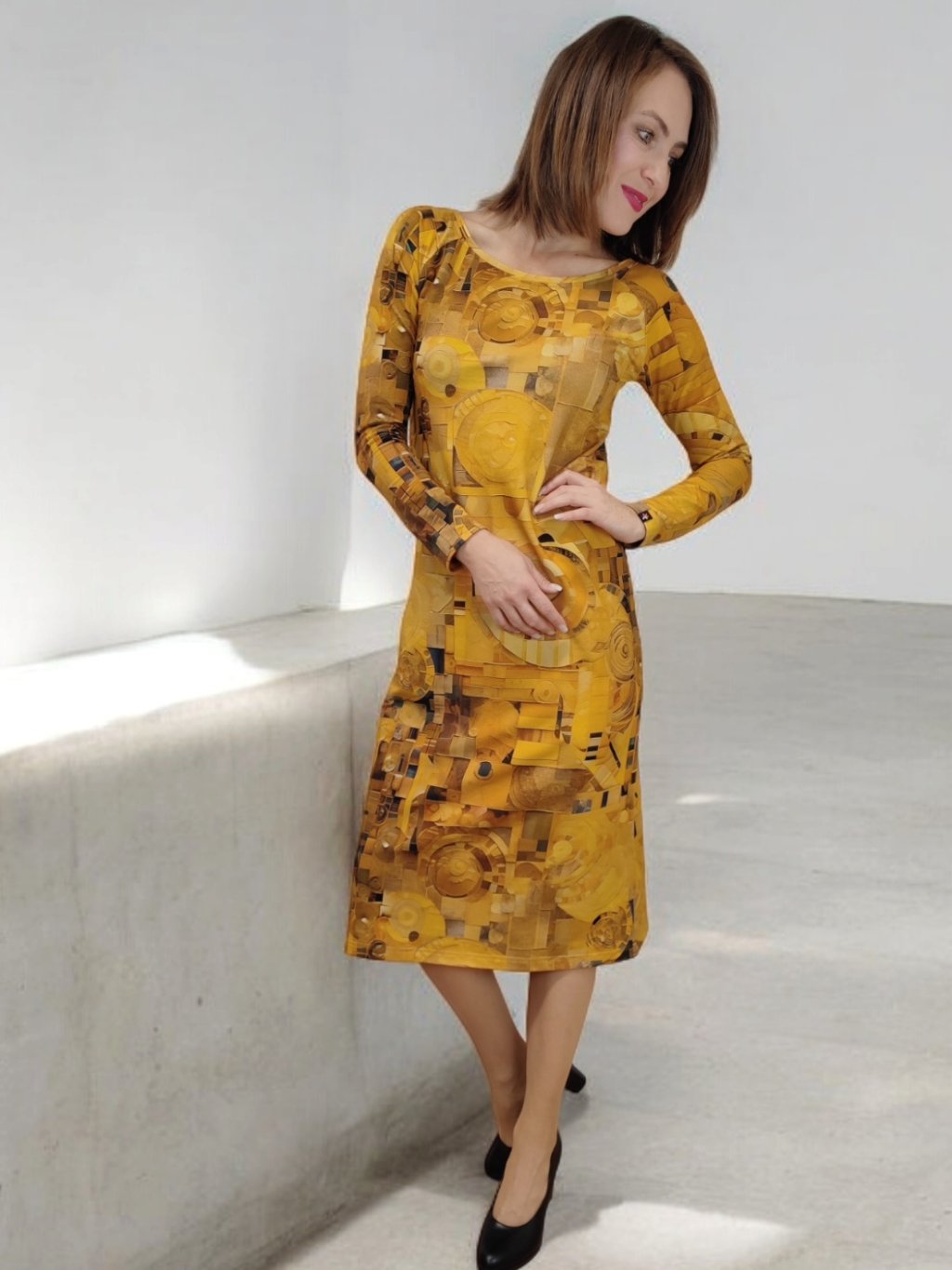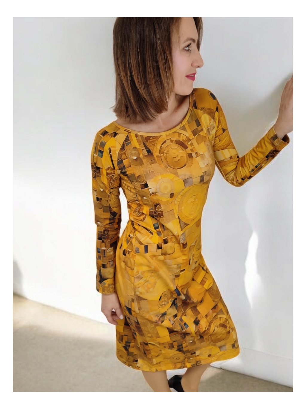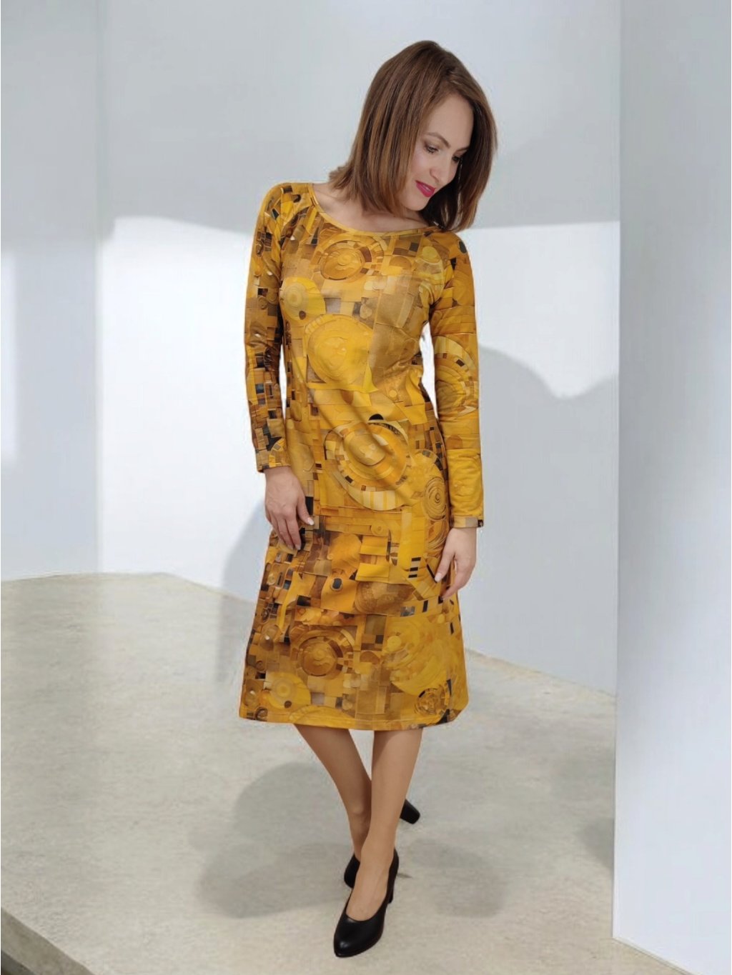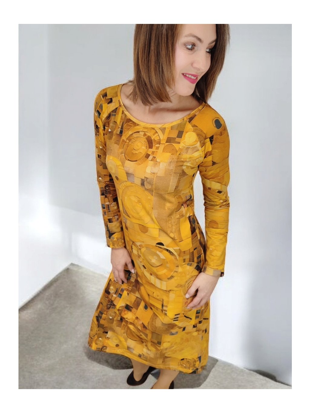 Šaty KELLY, okrová abstrakce, volba délky rukávů
