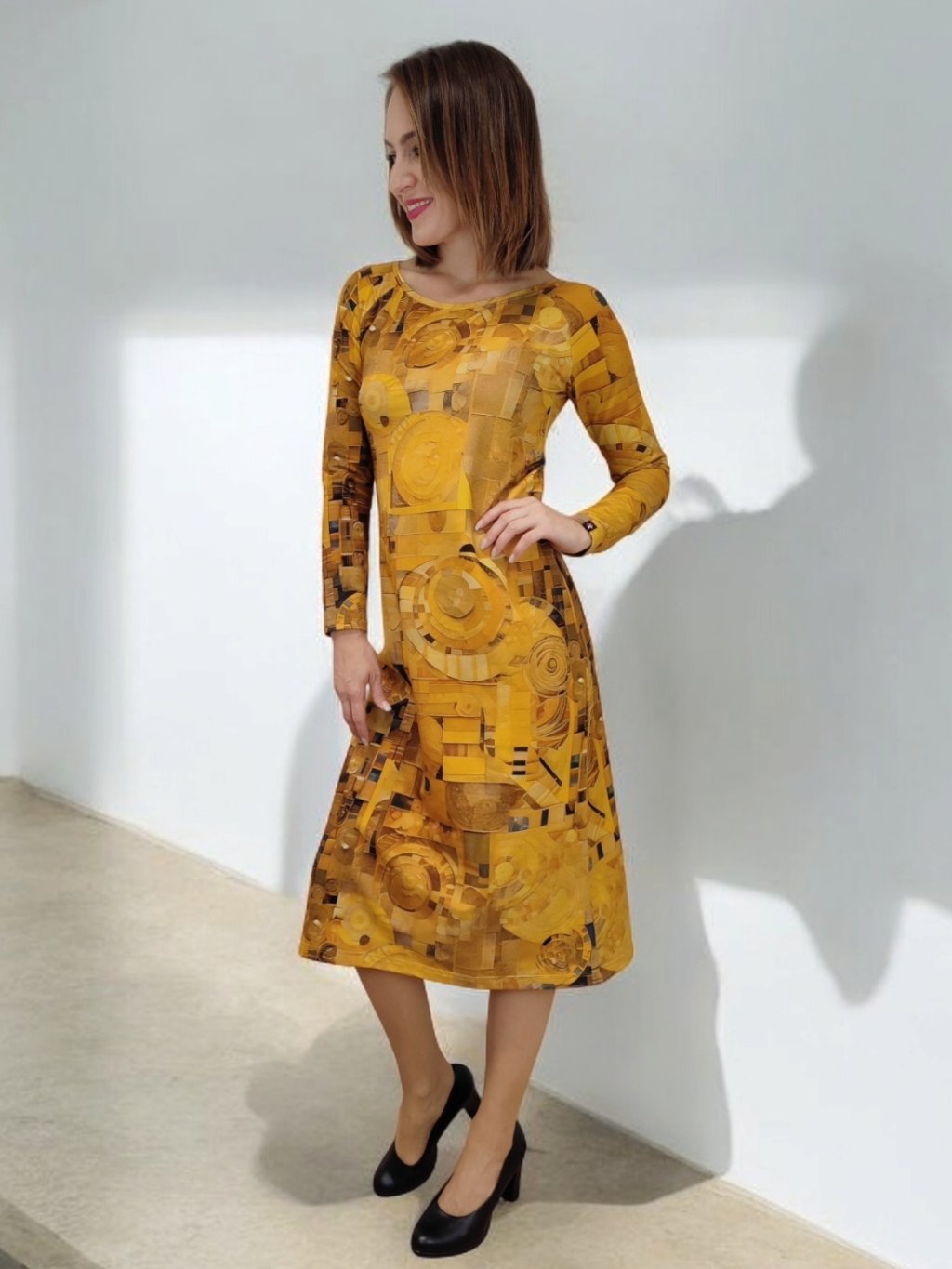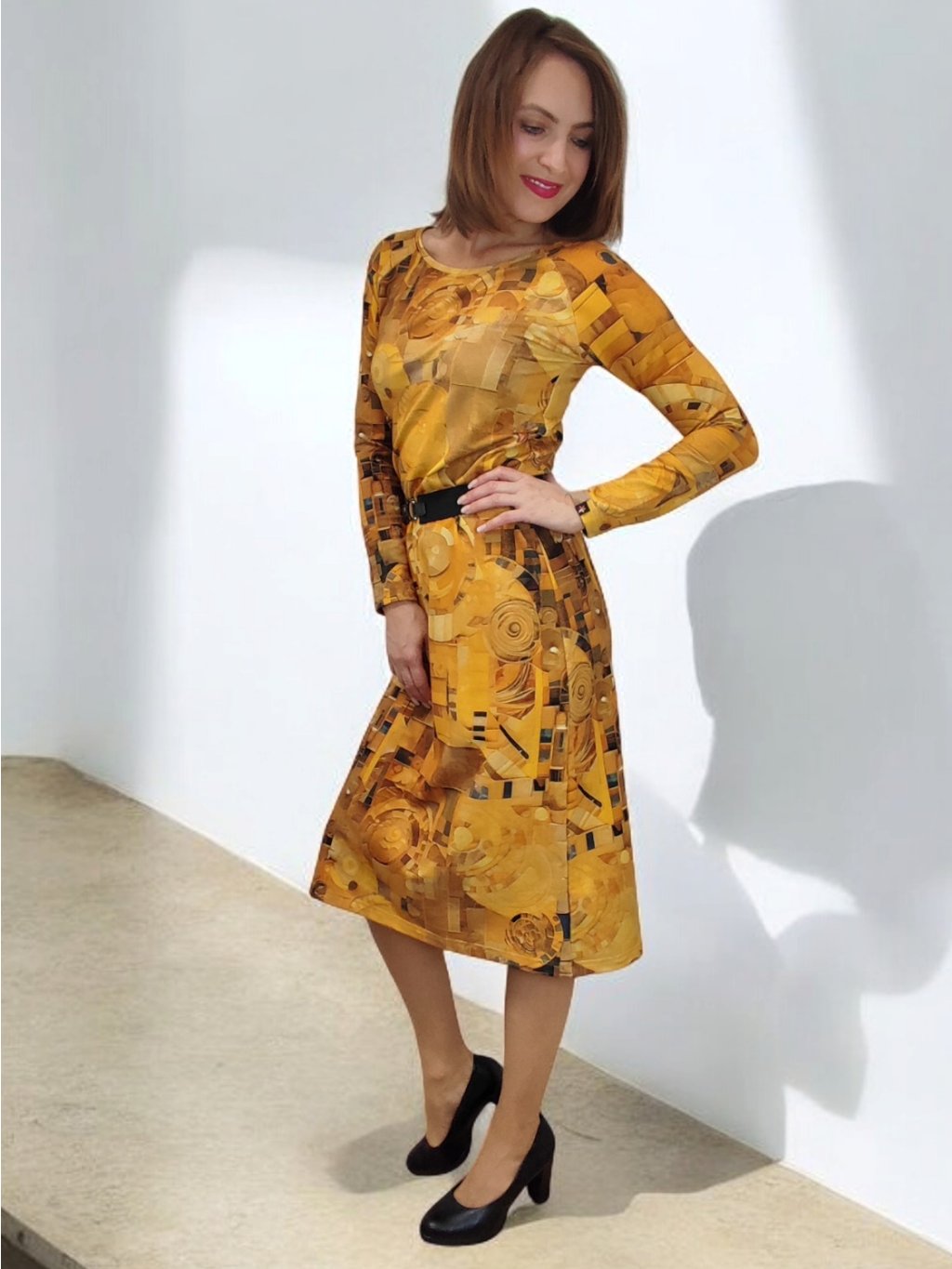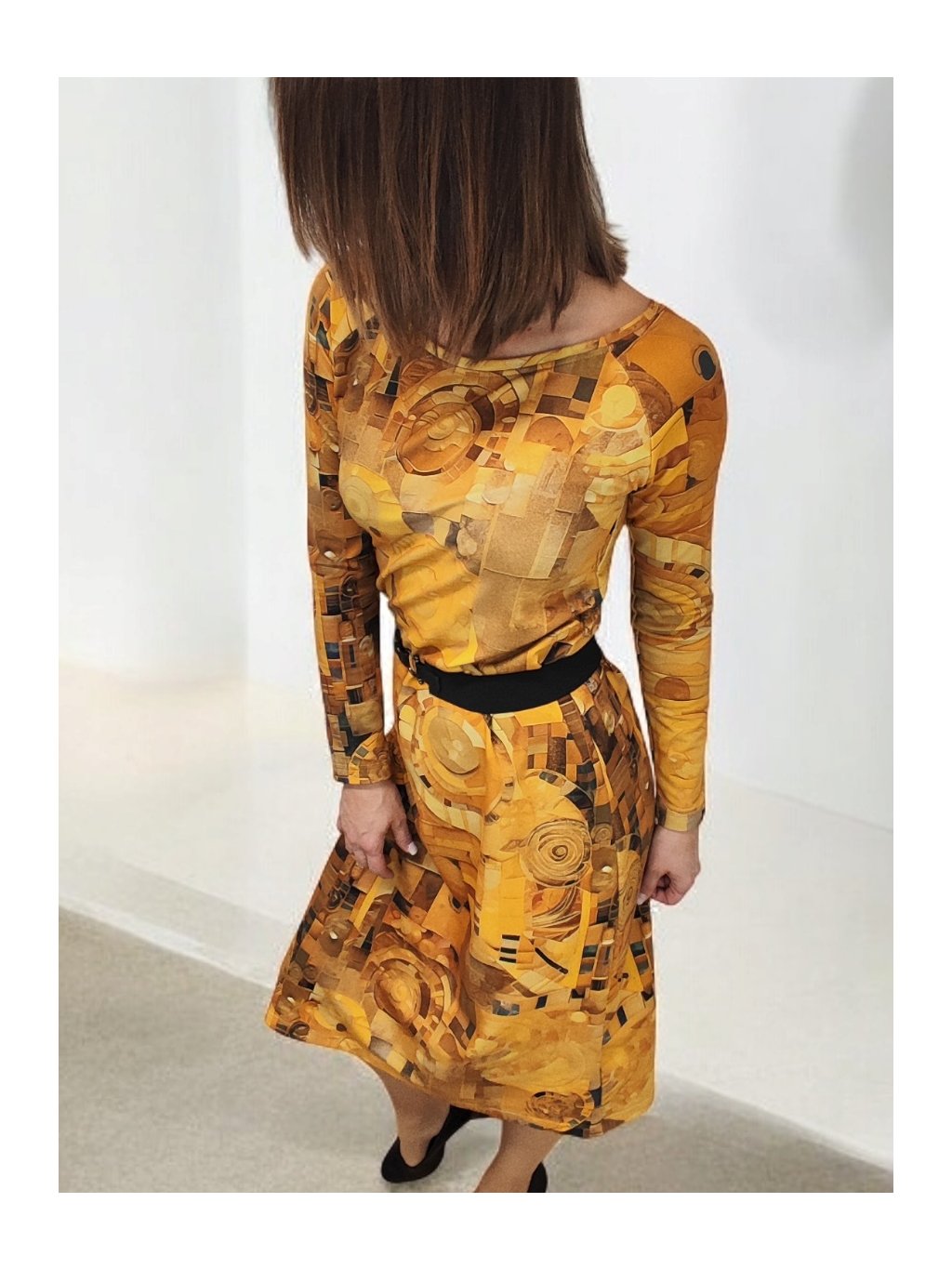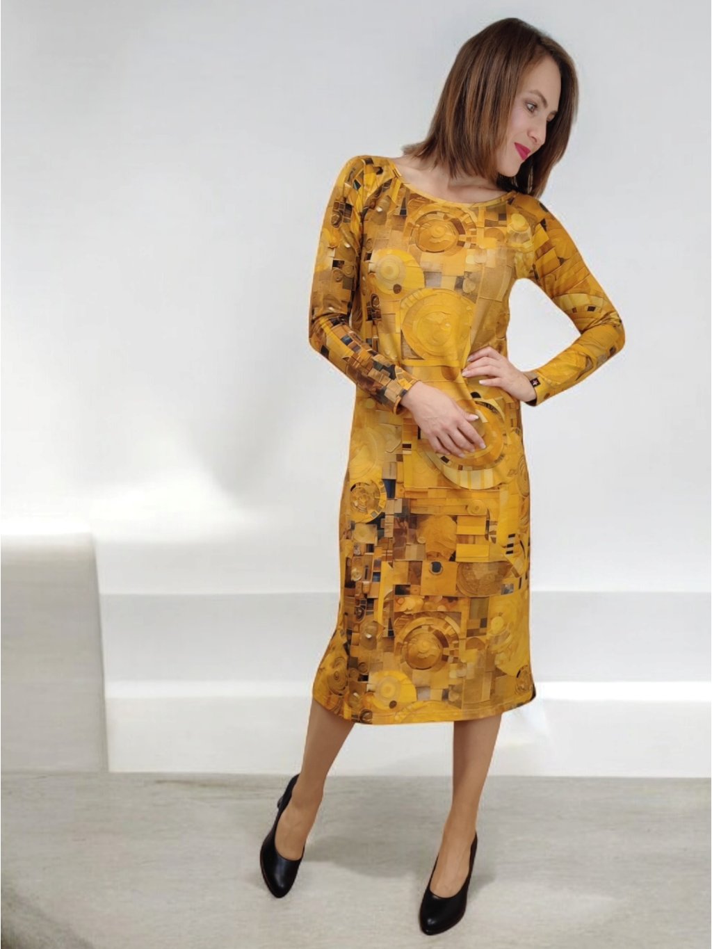 Šaty KELLY, okrová abstrakce, volba délky rukávů